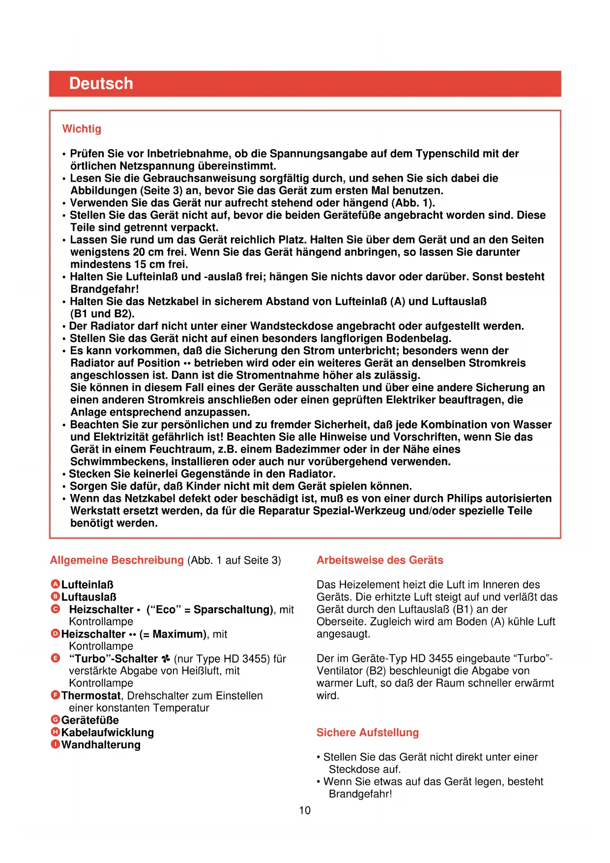 Allgemeine Beschreibung (Abb. 1 auf Seite 3) A Lufteinlaß B Luftauslaß C Heizschalter • (“Eco” = Sparschaltung), mit Kontrollampe D Heizschalter •• (= Maximum), mit Kontrollampe E “Turbo”-Schalter > (nur Type HD 3455) für verstärkte Abgabe von Heißluft, mit Kontrollampe F Thermostat, Drehschalter zum Einstellen einer konstanten Temperatur G Gerätefüße H Kabelaufwicklung I Wandhalterung Arbeitsweise des Geräts Das Heizelement heizt die Luft im Inneren des Geräts. Die erhitzte Luft steigt auf und verläßt das Gerät durch den Luftauslaß (B1) an der Oberseite. Zugleich wird am Boden (A) kühle Luft angesaugt. Der im Geräte-Typ HD 3455 eingebaute “Turbo”- Ventilator (B2) beschleunigt die Abgabe von warmer Luft, so daß der Raum schneller erwärmt wird. Sichere Aufstellung