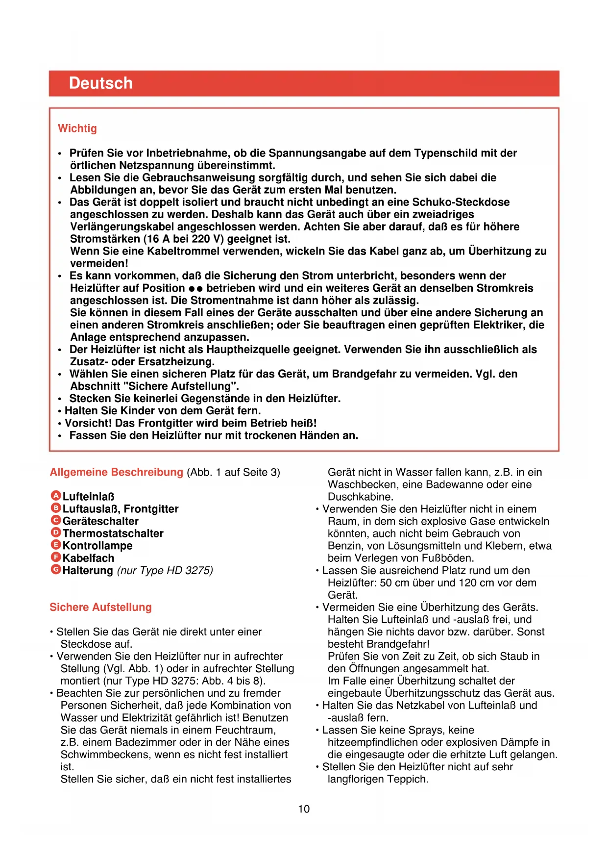 , um das Gerät auszuschalten. - Ziehen Sie den Netzstecker aus der Steckdose. - Warten Sie, bis das Gerät ausreichend abgekühlt ist. - Sie können das Äußere des Gehäuses mit einem angefeuchteten Tuch abwischen, auf das Sie bei Bedarf ein wenig Spülmittel aufgetragen haben. Achten Sie darauf, daß kein Wasser in das Innere des Geräts eindringt. - Reinigen Sie regelmäßig (bei normalem Gebrauch zweimal jährlich) die Lufteinlaß- und Luftauslaßöffnungen mit einem Staubsauger, unter Verwendung des Bürstenaufsatzes.13 Algemene beschrijving (fig. 1 op pag. 3) A Luchtinlaatrooster B Luchtuitstroomrooster C Schakelaar D Thermostaatknop E Controlelampje F Snoeropbergmogelijkheid G Voet / wandhouder (Alleen type HD 3275) Veilig plaatsen