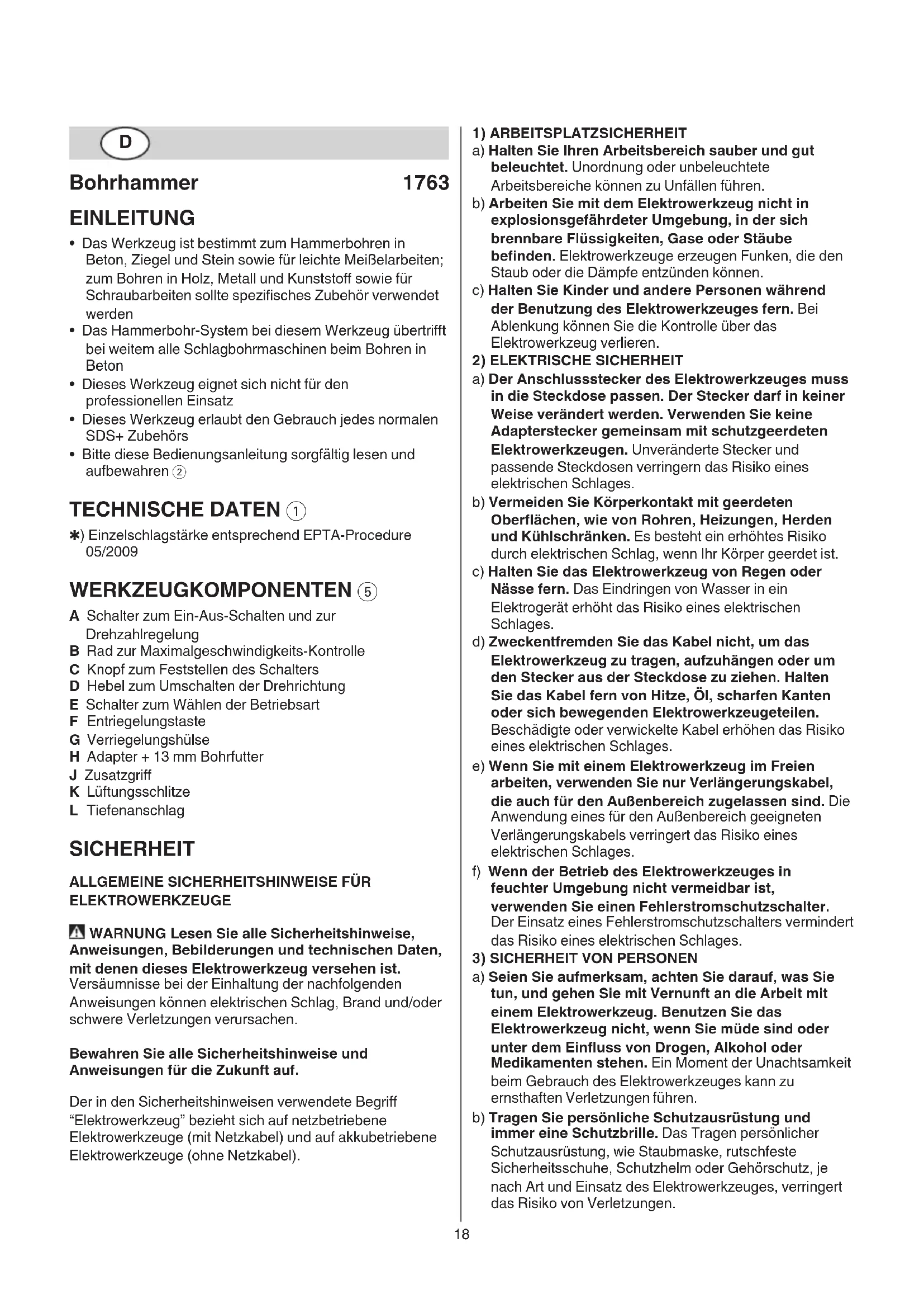 - Bitte diese Bedienungsanleitung sorgfältig lesen und aufbewahren 2 TECHNISCHE DATEN 1 ✱) Einzelschlagstärke entsprechend EPTA-Procedure 05/2009 WERKZEUGKOMPONENTEN 5 A Schalter zum Ein-Aus-Schalten und zur Drehzahlregelung B Rad zur Maximalgeschwindigkeits-Kontrolle C Knopf zum Feststellen des Schalters D Hebel zum Umschalten der Drehrichtung E Schalter zum Wählen der Betriebsart F Entriegelungstaste G Verriegelungshülse H Adapter + 13 mm Bohrfutter J Zusatzgri K Lüftungsschlitze L Tiefenanschlag SICHERHEIT