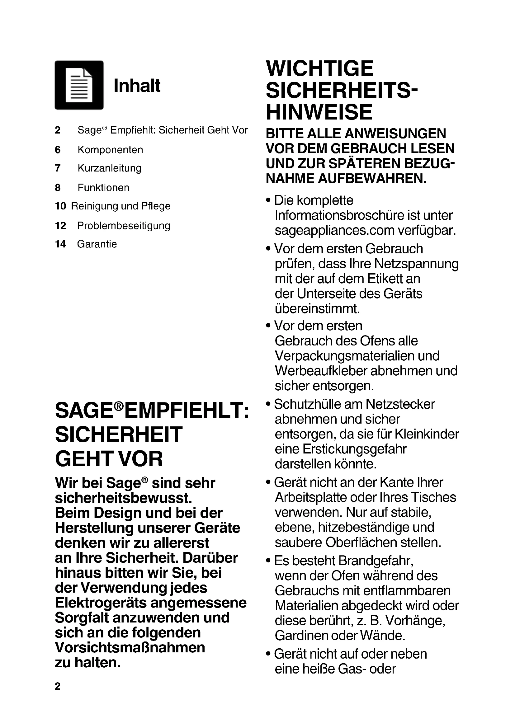 - Gerät nicht auf oder neben eine heiße Gas- oder Inhalt 2 Sage Empehlt: Sicherheit Geht Vor6 Komponenten7 Kurzanleitung8 Funktionen10 Reinigung und Pege12 Problembeseitigung14 Garantie SAGE