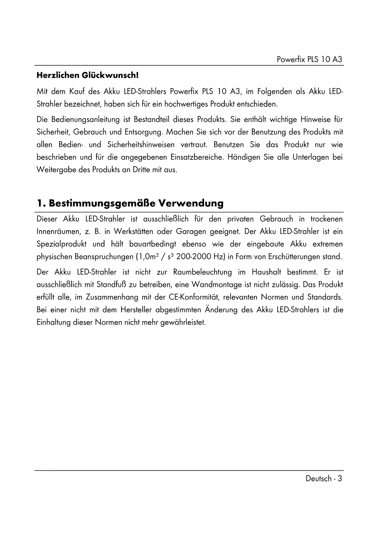 Deutsch - 3 Herzlichen Glückwunsch! Mit dem Kauf des Akku LED-Strahlers Powerfix PLS 10 A3, im Folgenden als Akku LED- Strahler bezeichnet, haben sich für ein hochwertiges Produkt entschieden. Die Bedienungsanleitung ist Bestandteil dieses Produkts. Sie enthält wichtige Hinweise für Sicherheit, Gebrauch und Entsorgung. Machen Sie sich vor der Benutzung des Produkts mit allen Bedien- und Sicherheitshinweisen vertraut. Benutzen Sie das Produkt nur wie beschrieben und für die angegebenen Einsatzbereiche. Händigen Sie alle Unterlagen bei Weitergabe des Produkts an Dritte mit aus.
