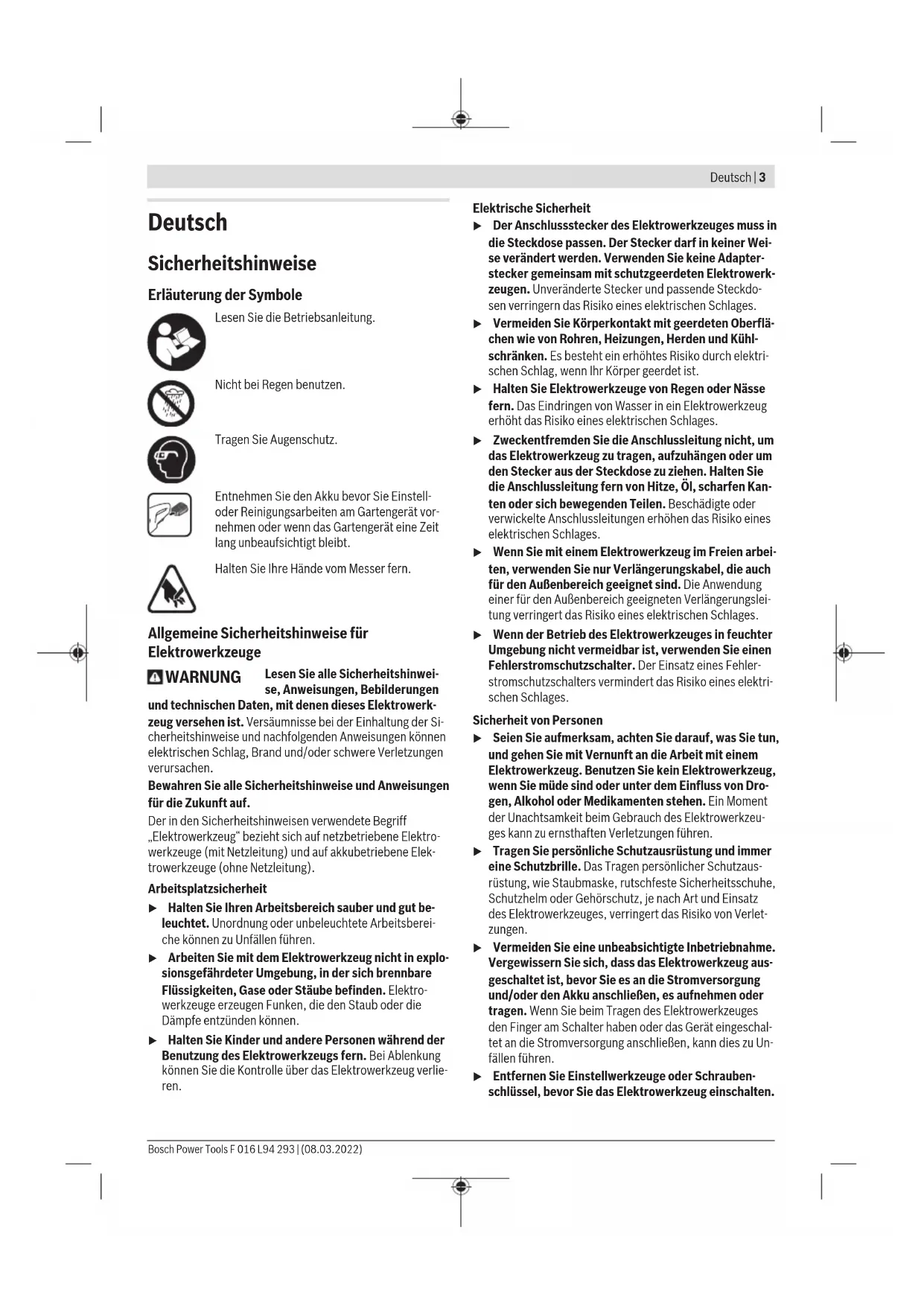F 016 L94 293 | (08.03.2022) Bosch Power ToolsDeutsch | 3 Deutsch Sicherheitshinweise Erläuterung der Symbole Lesen Sie die Betriebsanleitung. Nicht bei Regen benutzen. Tragen Sie Augenschutz. Entnehmen Sie den Akku bevor Sie Einstell- oder Reinigungsarbeiten am Gartengerät vor- nehmen oder wenn das Gartengerät eine Zeit lang unbeaufsichtigt bleibt. Halten Sie Ihre Hände vom Messer fern. Allgemeine Sicherheitshinweise für Elektrowerkzeuge WARNUNG Lesen Sie alle Sicherheitshinwei- se, Anweisungen, Bebilderungen und technischen Daten, mit denen dieses Elektrowerk- zeug versehen ist. Versäumnisse bei der Einhaltung der Si- cherheitshinweise und nachfolgenden Anweisungen können elektrischen Schlag, Brand und/oder schwere Verletzungen verursachen. Bewahren Sie alle Sicherheitshinweise und Anweisungen für die Zukunft auf. Der in den Sicherheitshinweisen verwendete Begriff „Elektrowerkzeug“ bezieht sich auf netzbetriebene Elektro- werkzeuge (mit Netzleitung) und auf akkubetriebene Elek- trowerkzeuge (ohne Netzleitung). Arbeitsplatzsicherheit u Halten Sie Ihren Arbeitsbereich sauber und gut be- leuchtet. Unordnung oder unbeleuchtete Arbeitsberei- che können zu Unfällen führen. u Arbeiten Sie mit dem Elektrowerkzeug nicht in explo- sionsgefährdeter Umgebung, in der sich brennbare Flüssigkeiten, Gase oder Stäube befinden. Elektro- werkzeuge erzeugen Funken, die den Staub oder die Dämpfe entzünden können. u Halten Sie Kinder und andere Personen während der Benutzung des Elektrowerkzeugs fern. Bei Ablenkung können Sie die Kontrolle über das Elektrowerkzeug verlie- ren. Elektrische Sicherheit u Der Anschlussstecker des Elektrowerkzeuges muss in die Steckdose passen. Der Stecker darf in keiner Wei- se verändert werden. Verwenden Sie keine Adapter- stecker gemeinsam mit schutzgeerdeten Elektrowerk- zeugen. Unveränderte Stecker und passende Steckdo- sen verringern das Risiko eines elektrischen Schlages. u Vermeiden Sie Körperkontakt mit geerdeten Oberflä- chen wie von Rohren, Heizungen, Herden und Kühl- schränken. Es besteht ein erhöhtes Risiko durch elektri- schen Schlag, wenn Ihr Körper geerdet ist. u Halten Sie Elektrowerkzeuge von Regen oder Nässe fern. Das Eindringen von Wasser in ein Elektrowerkzeug erhöht das Risiko eines elektrischen Schlages. u Zweckentfremden Sie die Anschlussleitung nicht, um das Elektrowerkzeug zu tragen, aufzuhängen oder um den Stecker aus der Steckdose zu ziehen. Halten Sie die Anschlussleitung fern von Hitze, Öl, scharfen Kan- ten oder sich bewegenden Teilen. Beschädigte oder verwickelte Anschlussleitungen erhöhen das Risiko eines elektrischen Schlages. u Wenn Sie mit einem Elektrowerkzeug im Freien arbei- ten, verwenden Sie nur Verlängerungskabel, die auch für den Außenbereich geeignet sind. Die Anwendung einer für den Außenbereich geeigneten Verlängerungslei- tung verringert das Risiko eines elektrischen Schlages. u Wenn der Betrieb des Elektrowerkzeuges in feuchter Umgebung nicht vermeidbar ist, verwenden Sie einen Fehlerstromschutzschalter. Der Einsatz eines Fehler- stromschutzschalters vermindert das Risiko eines elektri- schen Schlages. Sicherheit von Personen u Seien Sie aufmerksam, achten Sie darauf, was Sie tun, und gehen Sie mit Vernunft an die Arbeit mit einem Elektrowerkzeug. Benutzen Sie kein Elektrowerkzeug, wenn Sie müde sind oder unter dem Einfluss von Dro- gen, Alkohol oder Medikamenten stehen. Ein Moment der Unachtsamkeit beim Gebrauch des Elektrowerkzeu- ges kann zu ernsthaften Verletzungen führen. u Tragen Sie persönliche Schutzausrüstung und immer eine Schutzbrille. Das Tragen persönlicher Schutzaus- rüstung, wie Staubmaske, rutschfeste Sicherheitsschuhe, Schutzhelm oder Gehörschutz, je nach Art und Einsatz des Elektrowerkzeuges, verringert das Risiko von Verlet- zungen. u Vermeiden Sie eine unbeabsichtigte Inbetriebnahme. Vergewissern Sie sich, dass das Elektrowerkzeug aus- geschaltet ist, bevor Sie es an die Stromversorgung und/oder den Akku anschließen, es aufnehmen oder tragen. Wenn Sie beim Tragen des Elektrowerkzeuges den Finger am Schalter haben oder das Gerät eingeschal- tet an die Stromversorgung anschließen, kann dies zu Un- fällen führen. u Entfernen Sie Einstellwerkzeuge oder Schrauben- schlüssel, bevor Sie das Elektrowerkzeug einschalten. Bosch Power Tools F 016 L94 293 | (08.03.2022)4 | Deutsch Ein Werkzeug oder Schlüssel, der sich in einem drehen- den Geräteteil befindet, kann zu Verletzungen führen. u Vermeiden Sie eine abnormale Körperhaltung. Sorgen Sie fu