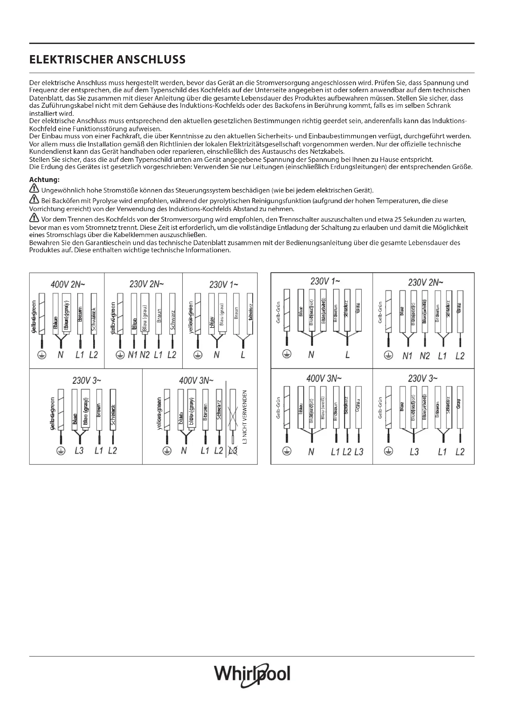 Laden Sie di e komplette Bedienungsanleitung auf http://docs.whirlpool.eu herunter oder rufen Sie die Telefonnummer auf dem Garantieheft an. Diese Sicherheitsanweisungen vor dem Gebrauch durchlesen. Diese Anweisungen zum Nachschlagen leicht zugänglich aufbewahren. In diesen Anweisungen sowie auf dem Gerät selbst werden wichtige Sicherheitshinweise angegeben, die durchgelesen und stets beachtet werden müssen. Der Hersteller übernimmt keine Haftung für die Nichtbeachtung dieser Sicherheitshinweise, für unsachgemäße Verwendung des Geräts oder falsche Bedienungseinstellung. WARNUNG: Wenn die Kochfeldoberäche r issig ist, das Gerät nicht verwenden - Stromschlaggefahr. WARNUNG: Brandgefahr: Lagern Sie nichts auf der Kochoberäche. VORSICHT: Das Garverfahren muss überwacht werden. Ein kurzes Garverfahren muss kontinuierlich überwacht werden. WARNUNG: Unbeaufsichtigtes Garen mit Fett oder Öl auf einem Kochfeld kann gefährlich sein - Brandgefahr. NIEMALS versuchen, das Feuer mit Wasser zu löschen: Stattdessen das Gerät ausschalten und dann die Flamme zum Beispiel mit einem Deckel oder einer Löschdecke abdecken. B enutzen Sie die Kochmulde nicht als Arbeitsäche oder Ablage. Kleidung oder andere brennbare Materialien vom Gerät fernhalten, bis alle Komponenten vollständig abgekühlt sind - Brandgefahr. Metallgegenstände wie Messer, Gabeln, Löel und Deckel sollten nicht auf die Kochfeldoberäche gelegt werden, da sie heiß werden können. Babys und Kleinkinder (0-3 Jahre) müssen vom Gerät ferngehalten werden. Jüngere Kinder (3-8 Jahre) müssen vom Gerät ferngehalten werden, es sei denn, sie werden ständig beaufsichtigt. Dieses Gerät darf von Kindern ab 8 Jahren sowie Personen mit herabgesetzten physischen, sensorischen oder geistigen Fähigkeiten und Mangel an Erfahrung und Kenntnissen nur unter Aufsicht oder nach ausreichender Einweisung durch eine für ihre Sicherheit verantwortliche Person verwendet werden. Kinder dürfen nicht mit dem Gerät spielen. Die Reinigung und Pege d es G erätes d ürfen v on Kindern nicht ohne Aufsicht durchgeführt werden. Schalten Sie das Kochfeld nach der Benutzung mit den Bedienelementen aus und verlassen Sie sich nicht allein auf die Topferkennung. WARNUNG: Das Gerät und die zugänglichen Teile werden bei der Benutzung heiß. Das Berühren der Heizelemente ist unbedingt zu vermeiden. Kinder unter 8 Jahren dürfen sich dem Gerät nur unter Aufsicht nähern.