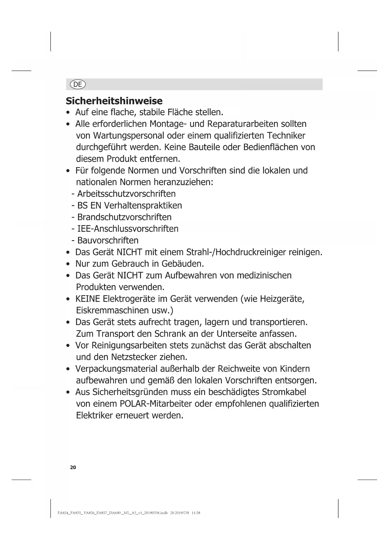 - Aus Sicherheitsgründen muss ein beschädigtes Stromkabel von einem POLAR-Mitarbeiter oder empfohlenen qualifizierten Elektriker erneuert werden. FA854_FA855_ FA856_FA857_DA680 _ML_A5_v1_20190708.indb 20 2019/7/8 11:5821