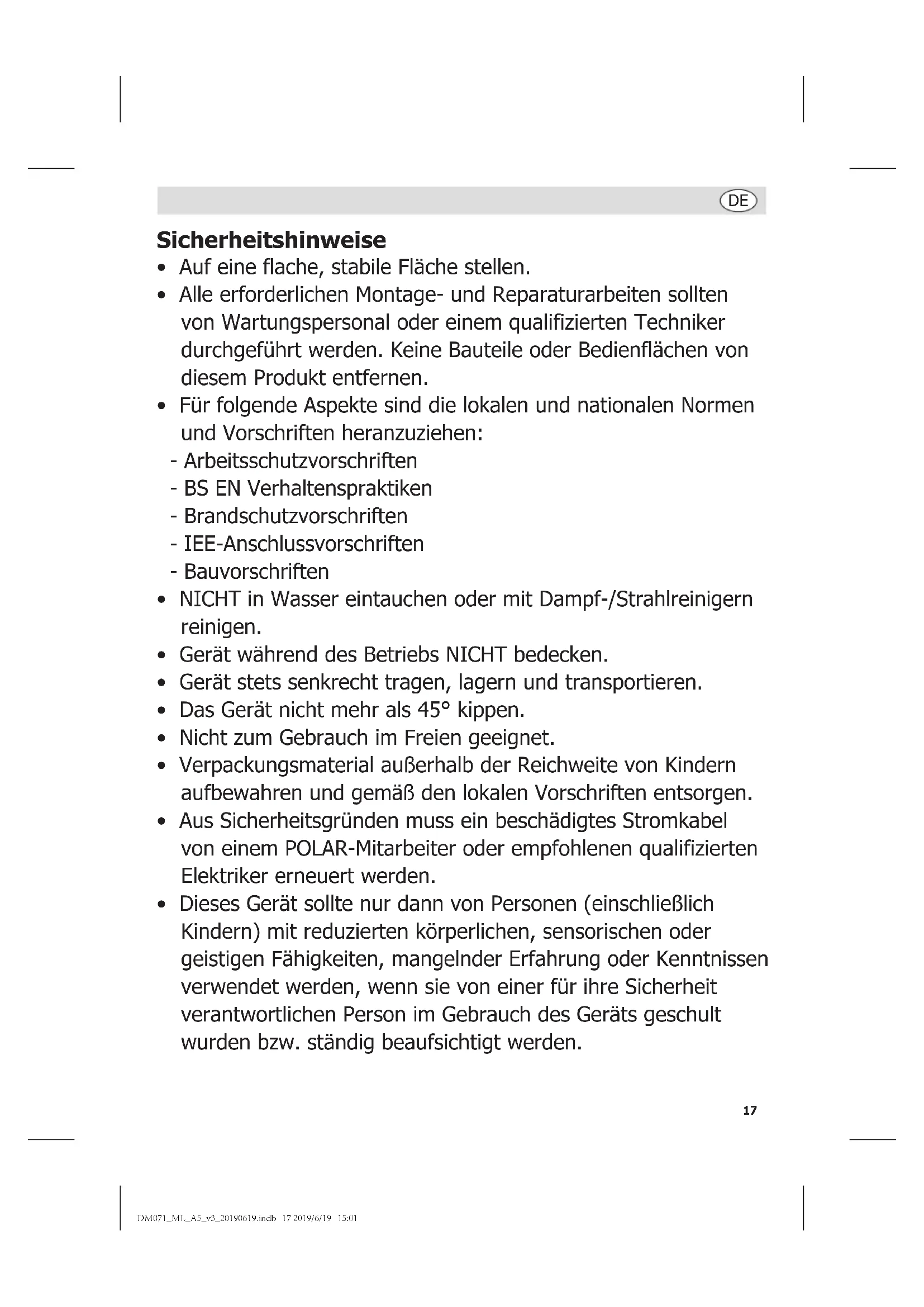 - Bedienungsanleitung POLAR ist stolz auf die hochwertige Qualität seiner Produkte und seinen erstklassigen Service. Wir stellen sicher, dass alle gelieferten Produkte zum Zeitpunkt der Verpackung voll funktionsfähig sind und sich in einwandfreiem Zustand befinden. Sollten Sie Transportschäden feststellen, wenden Sie sich bitte unverzüglich an Ihren POLAR-Händler. DM071_ML_A5_v3_20190619.indb 18 2019/6/19 15:0119