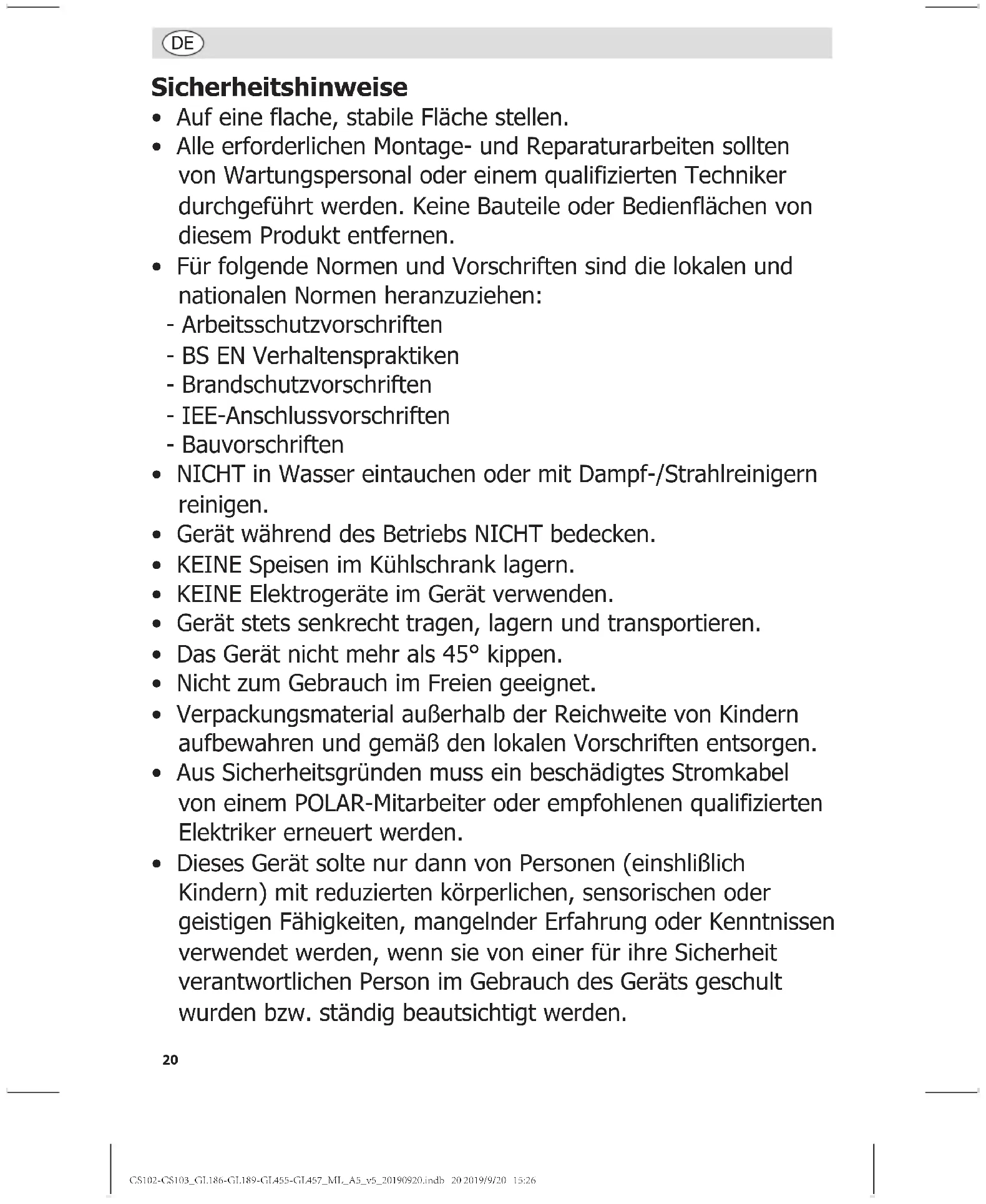 - Erforderliche Reparaturen sollten von einem POLAR-Mitarbeiter oder einem qualifizierten Techniker ausgeführt werden. CS102-CS103_GL186-GL189-GL455-GL457_ML_A5_v5_20190920.indb 22 2019/9/20 15:2623