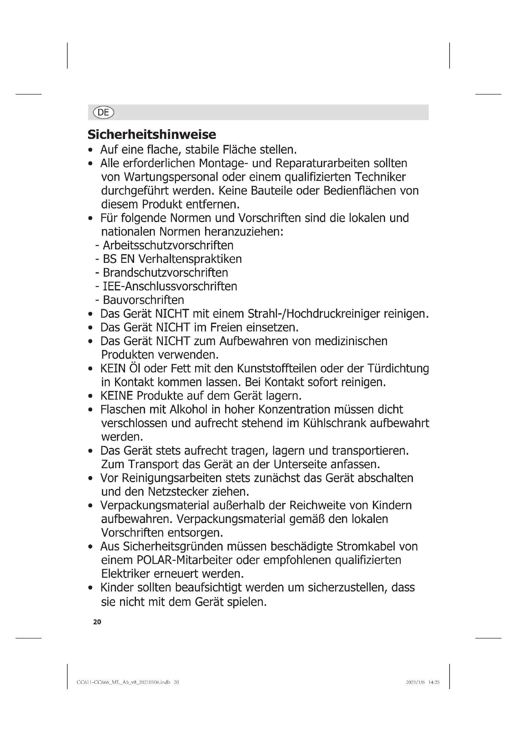 Vorsicht beim Reinigen der Geräterückseite. Scharfe Kanten konnen zu Verletzungen führen. - Erforderliche Reparaturen sollen von einem POLAR-Mitarbeiter oder einem qualifizierten Techniker ausgeführten werden.