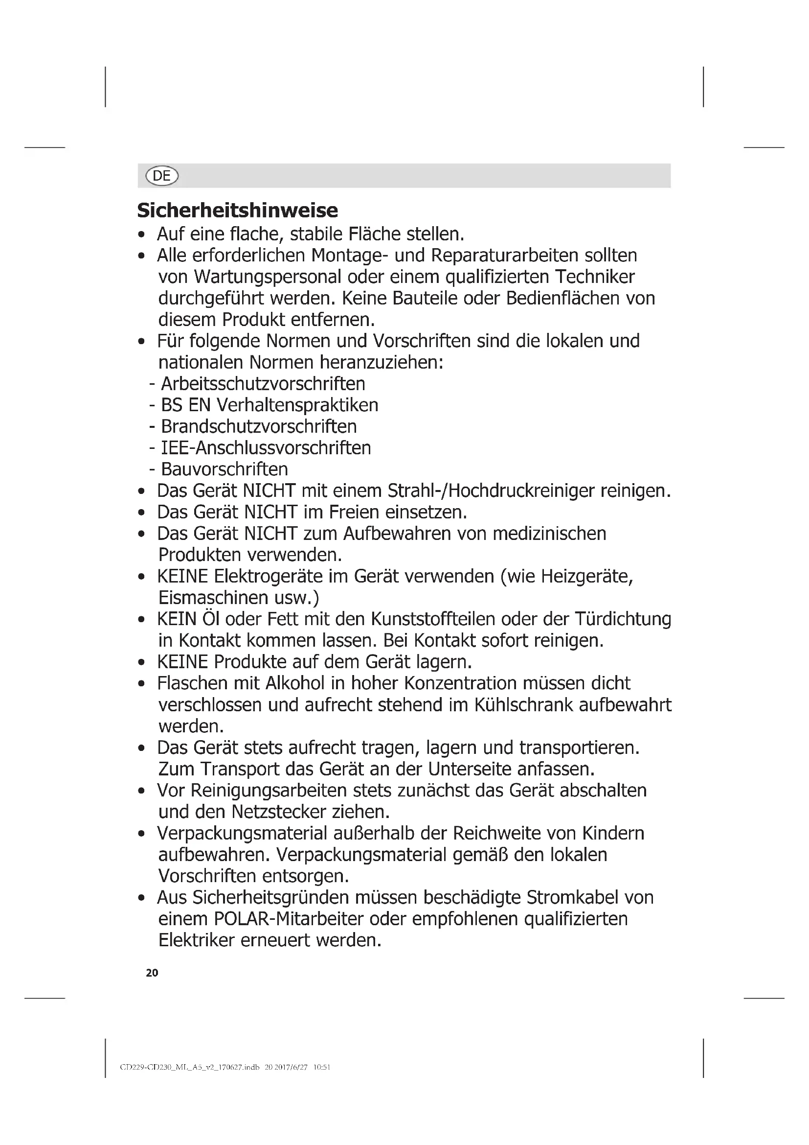 - Bedienungsanleitung POLAR ist stolz auf die hochwertige Qualität seiner Produkte und seinen erstklassigen Service. Wir stellen sicher, dass alle gelieferten Produkte zum Zeitpunkt der Verpackung voll funktionsfähig sind und sich in einwandfreiem Zustand befinden. Sollten Sie Transportschäden feststellen, wenden Sie sich bitte unverzüglich an Ihren POLAR-Händler. CD229-CD230_ML_A5_v2_170627.indb 21 2017/6/27 10:5122