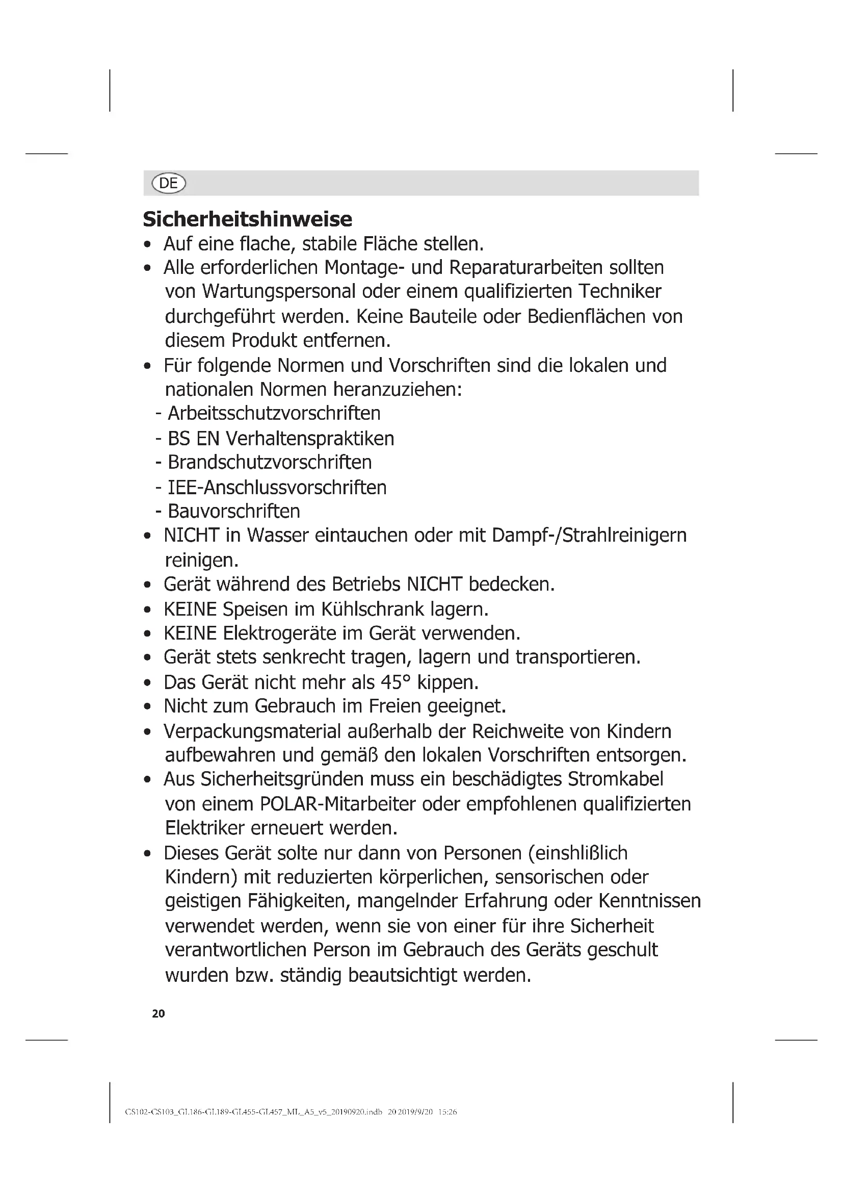 - Erforderliche Reparaturen sollten von einem POLAR-Mitarbeiter oder einem qualifizierten Techniker ausgeführt werden. CS102-CS103_GL186-GL189-GL455-GL457_ML_A5_v5_20190920.indb 22 2019/9/20 15:2623