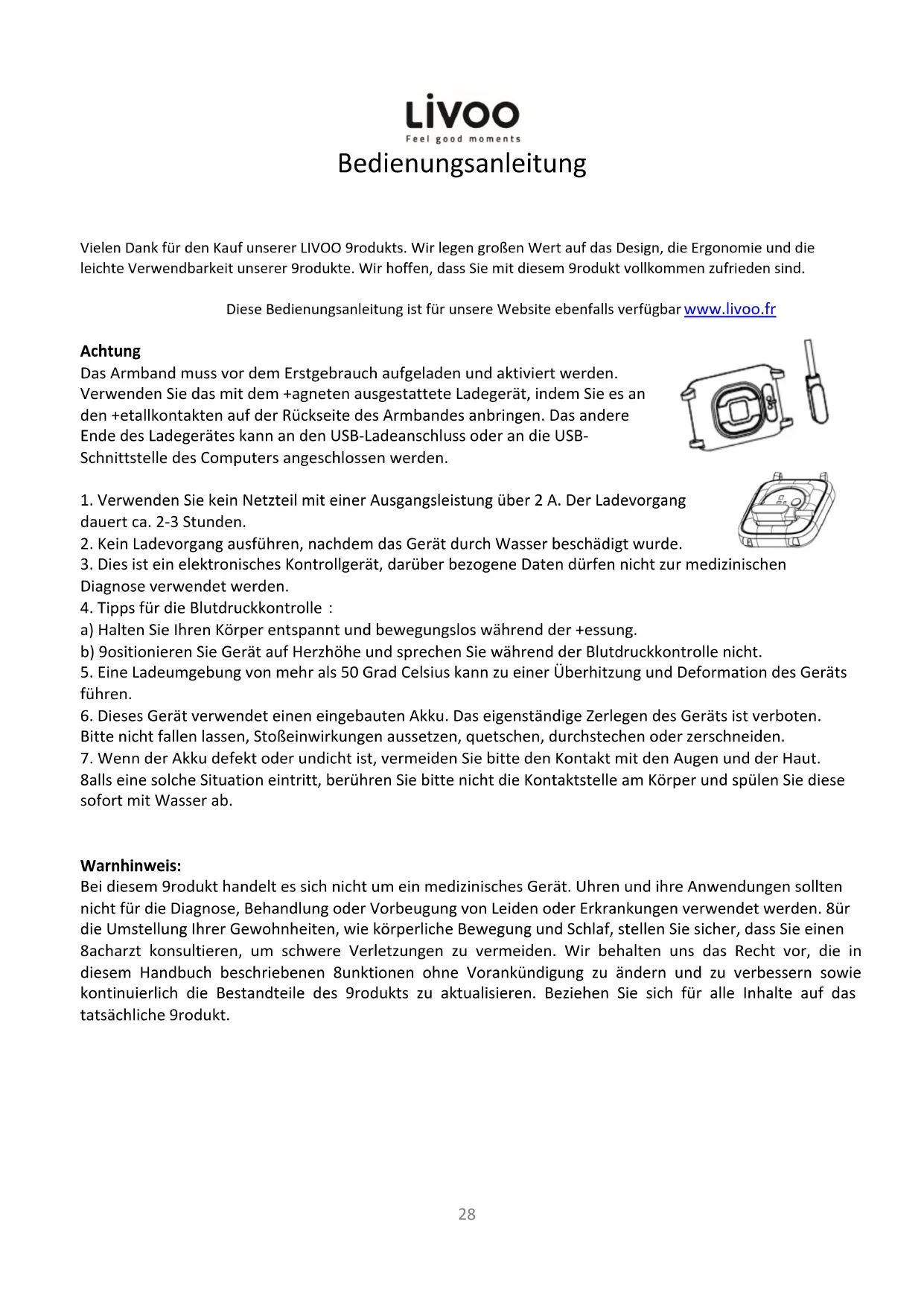 Vielen Dank für den Kauf unserer LIVOO Produkts. Wir legen großen Wert auf das Design, die Ergonomie und die leichte Verwendbarkeit unserer Produkte. Wir hoffen, dass Sie mit diesem Produkt vollkommen zufrieden sind. Diese Bedienungsanleitung ist für unsere Website ebenfalls verfügbar www.livoo.fr Achtung Das Armband muss vor dem Erstgebrauch aufgeladen und aktiviert werden. Verwenden Sie das mit dem Magneten ausgestattete Ladegerät, indem Sie es an den Metallkontakten auf der Rückseite des Armbandes anbringen. Das andere Ende des Ladegerätes kann an den USB-Ladeanschluss oder an die USB- Schnittstelle des Computers angeschlossen werden.