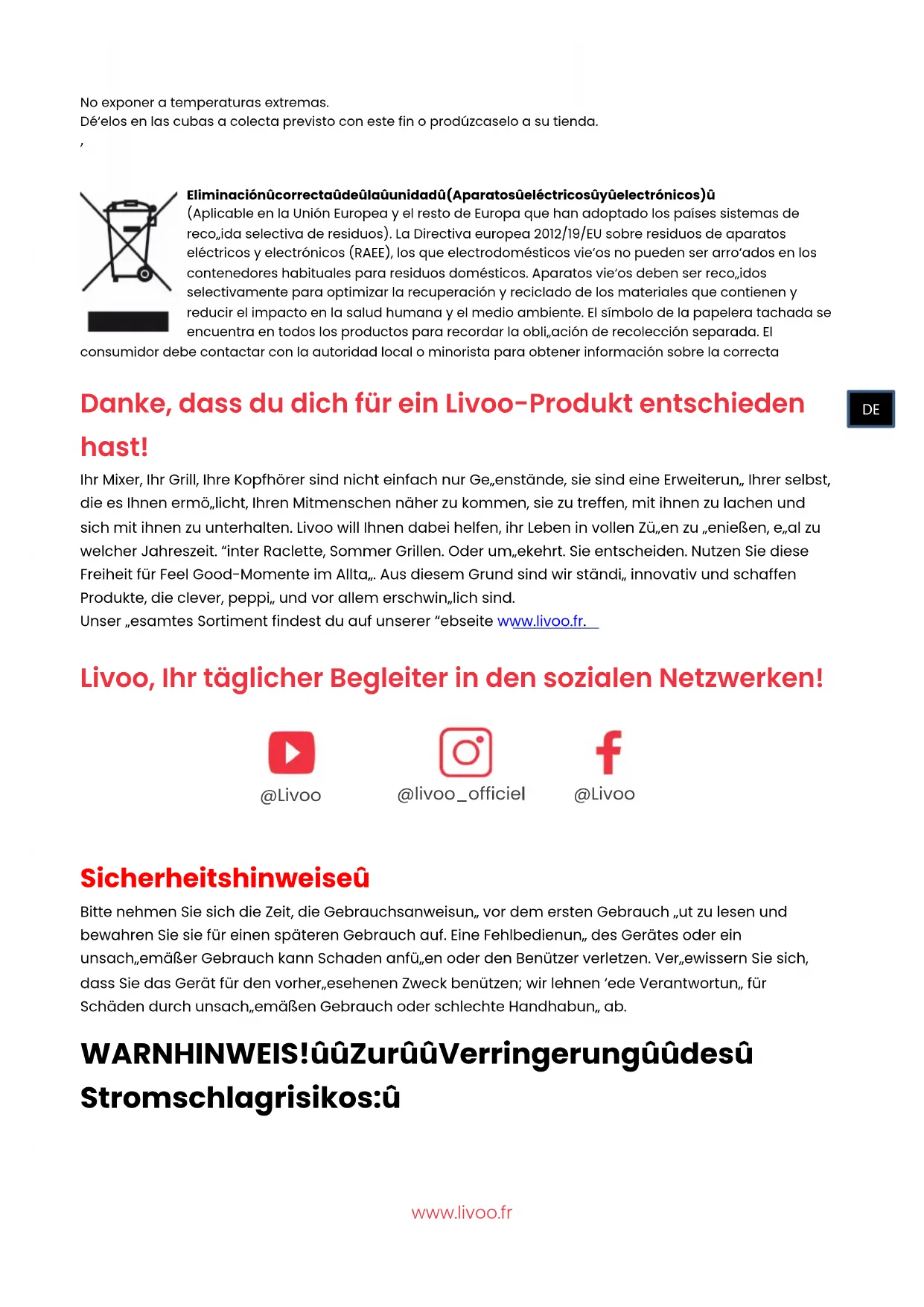 Sicherheitshinweise Bitte nehmen Sie sich die Zeit, die Gebrauchsanweisung vor dem ersten Gebrauch gut zu lesen und bewahren Sie sie für einen späteren Gebrauch auf. Eine Fehlbedienung des Gerätes oder ein unsachgemäßer Gebrauch kann Schaden anfügen oder den Benützer verletzen. Vergewissern Sie sich, dass Sie das Gerät für den vorhergesehenen Zweck benützen; wir lehnen jede Verantwortung für Schäden durch unsachgemäßen Gebrauch oder schlechte Handhabung ab. WARNHINWEIS! Zur Verringerung des Stromschlagrisikos: @livoo_officiel