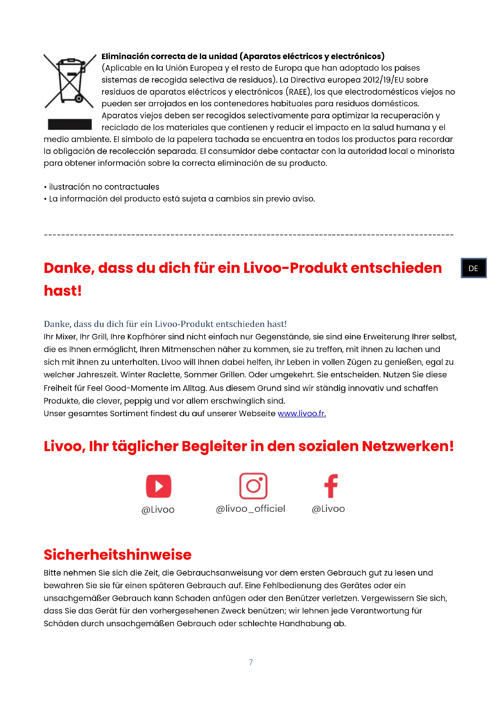 Sicherheitshinweise Bitte nehmen Sie sich die Zeit, die Gebrauchsanweisung vor dem ersten Gebrauch gut zu lesen und bewahren Sie sie für einen späteren Gebrauch auf. Eine Fehlbedienung des Gerätes oder ein unsachgemäßer Gebrauch kann Schaden anfügen oder den Benützer verletzen. Vergewissern Sie sich, dass Sie das Gerät für den vorhergesehenen Zweck benützen; wir lehnen jede Verantwortung für Schäden durch unsachgemäßen Gebrauch oder schlechte Handhabung ab. @livoo_officiel @Livoo @Livoo DE8