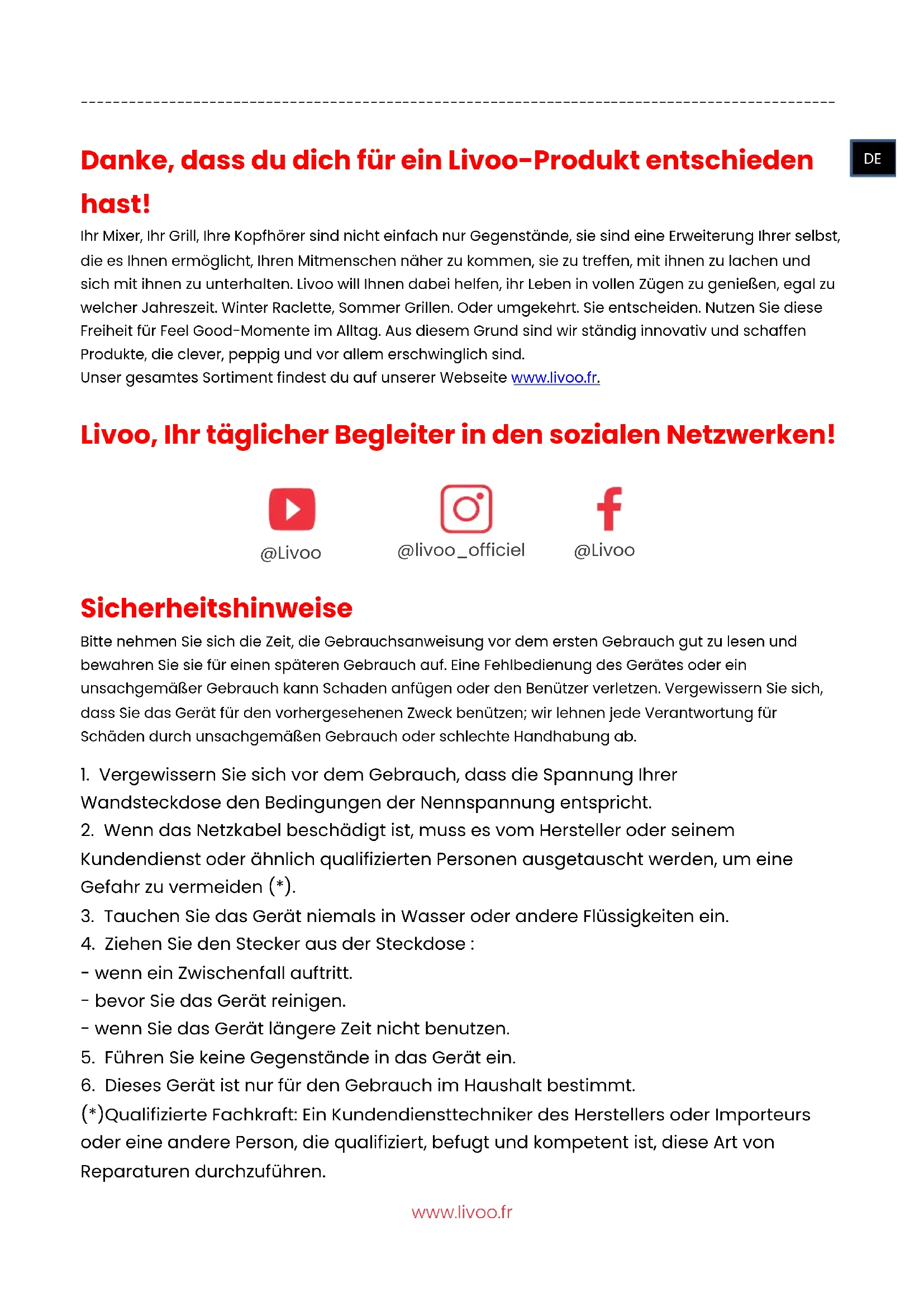 Danke, dass du dich für ein Livoo-Produkt entschieden hast! Ihr Mixer, Ihr Grill, Ihre Kopfhörer sind nicht einfach nur Gegenstände, sie sind eine Erweiterung Ihrer selbst, die es Ihnen ermöglicht, Ihren Mitmenschen näher zu kommen, sie zu treffen, mit ihnen zu lachen und sich mit ihnen zu unterhalten. Livoo will Ihnen dabei helfen, ihr Leben in vollen Zügen zu genießen, egal zu welcher Jahreszeit. Winter Raclette, Sommer Grillen. Oder umgekehrt. Sie entscheiden. Nutzen Sie diese Freiheit für Feel Good-Momente im Alltag. Aus diesem Grund sind wir ständig innovativ und schaffen Produkte, die clever, peppig und vor allem erschwinglich sind. Unser gesamtes Sortiment findest du auf unserer Webseite www.livoo.fr. Livoo, Ihr täglicher Begleiter in den sozialen Netzwerken!