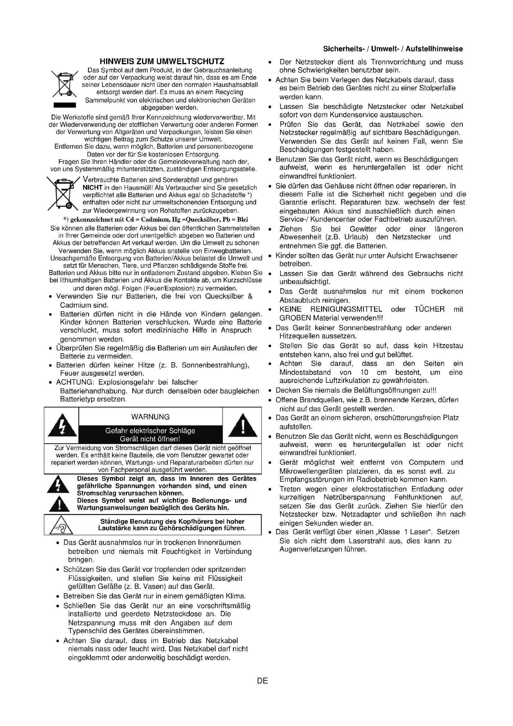 Verbrauchte Batterien sind Sonderabfall und gehören NICHT in den Hausmüll! Als Verbraucher sind Sie gesetzlich verpflichtet alle Batterien und Akkus egal ob Schadstoffe *) enthalten oder nicht zur umweltschonenden Entsorgung und zur Wiedergewinnung von Rohstoffen zurückzugeben. *) gekennzeichnet mit Cd = Cadmium, Hg =Quecksilber, Pb = Blei Sie können alle Batterien oder Akkus bei den öffentlichen Sammelstellen in Ihrer Gemeinde oder dort unentgeltlich abgeben wo Batterien und Akkus der betreffenden Art verkauf werden. Um die Umwelt zu schonen Verwenden Sie, wenn möglich Akkus anstelle von Einwegbatterien. Unsachgemäße Entsorgung von Batterien/Akkus belastet die Umwelt und setzt für Menschen, Tiere, und Pflanzen schädigende Stoffe frei. Batterien und Akkus bitte nur in entladenem Zustand abgeben. Kleben Sie bei lithiumhaltigen Batterien und Akkus die Kontakte ab, um Kurzschlüsse und deren mögl. Folgen (Feuer/Explosion) zu vermeiden.