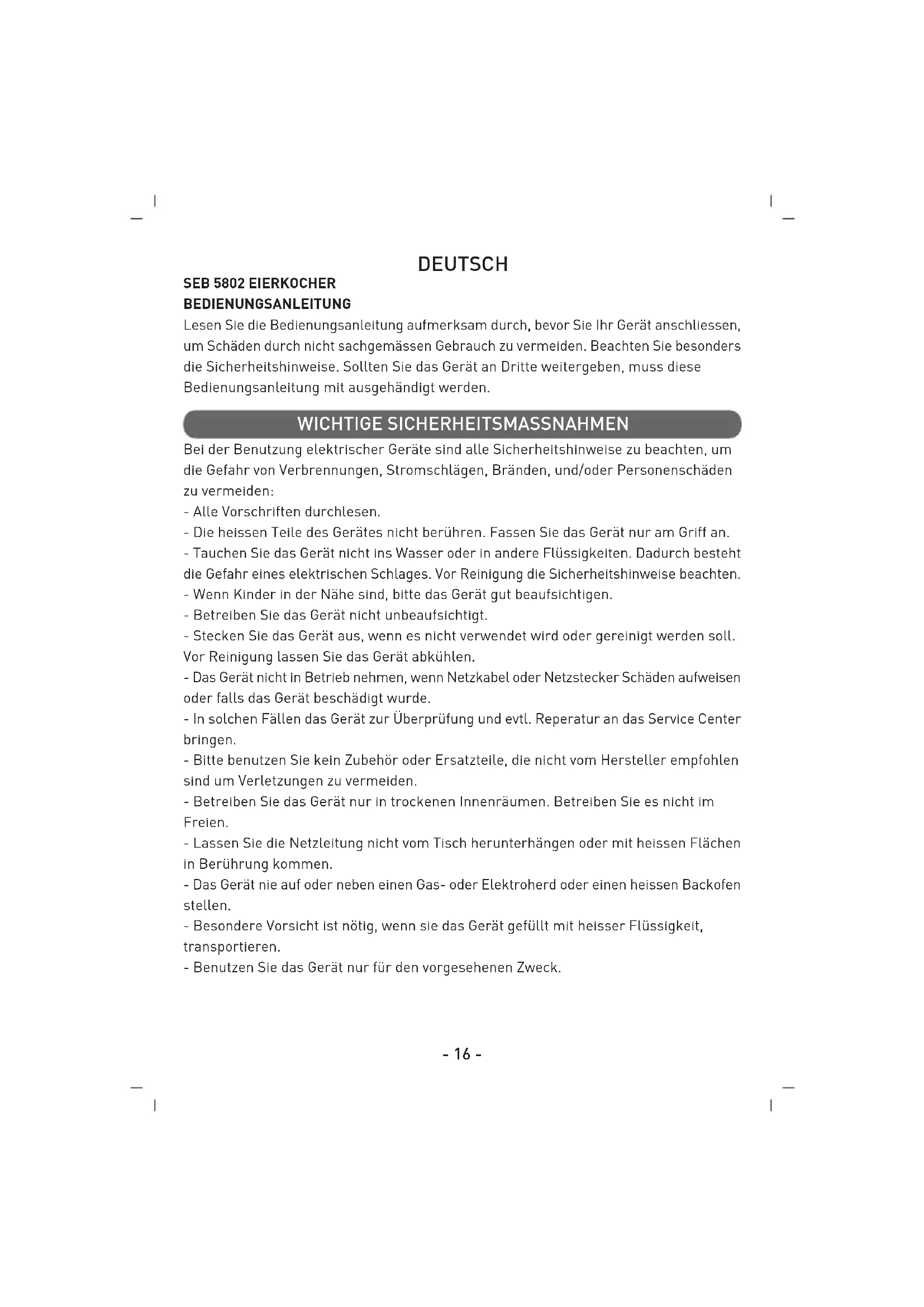 Vóór de levering worden onze toestellen aan een strenge kwaliteitscontrole onderworpen. Indien het toestel ondanks alle zorg bij de productie of tijdens het transport beschadigd werd, moet u het naar de verkoper terugbrengen. Behalve de wettelijk vastgelegde rechten kan de koper onder de volgende voorwaarden aanspraak maken op garantie: Wij geven een garantie van 2 jaar op het toestel vanaf de aankoopdatum.- 15 - GARANTIE KLANTENSERVICE Tijdens die periode verhelpen wij gratis alle gebreken die te wijten zijn aan materiaal- of productiefouten door reparatie of vervanging. Gebreken die het gevolg zijn van ondeskundig gebruik van het toestel, fouten tijdens ingrepen en reparaties door derden of door de inbouw van niet-originele onderdelen, vallen niet onder deze garantie.- 16 - DEUTSCH SEB 5802 EIERKOCHER BEDIENUNGSANLEITUNG Lesen Sie die Bedienungsanleitung aufmerksam durch, bevor Sie Ihr Gerät anschliessen, um Schäden durch nicht sachgemässen Gebrauch zu vermeiden. Beachten Sie besonders die Sicherheitshinweise. Sollten Sie das Gerät an Dritte weitergeben, muss diese Bedienungsanleitung mit ausgehändigt werden. Bei der Benutzung elektrischer Geräte sind alle Sicherheitshinweise zu beachten, um die Gefahr von Verbrennungen, Stromschlägen, Bränden, und/oder Personenschäden zu vermeiden: - Alle Vorschriften durchlesen. - Die heissen Teile des Gerätes nicht berühren. Fassen Sie das Gerät nur am Griff an. - Tauchen Sie das Gerät nicht ins Wasser oder in andere Flüssigkeiten. Dadurch besteht die Gefahr eines elektrischen Schlages. Vor Reinigung die Sicherheitshinweise beachten. - Wenn Kinder in der Nähe sind, bitte das Gerät gut beaufsichtigen. - Betreiben Sie das Gerät nicht unbeaufsichtigt. - Stecken Sie das Gerät aus, wenn es nicht verwendet wird oder gereinigt werden soll. Vor Reinigung lassen Sie das Gerät abkühlen. - Das Gerät nicht in Betrieb nehmen, wenn Netzkabel oder Netzstecker Schäden aufweisen oder falls das Gerät beschädigt wurde. - In solchen Fällen das Gerät zur Überprüfung und evtl. Reperatur an das Service Center bringen. - Bitte benutzen Sie kein Zubehör oder Ersatzteile, die nicht vom Hersteller empfohlen sind um Verletzungen zu vermeiden. - Betreiben Sie das Gerät nur in trockenen Innenräumen. Betreiben Sie es nicht im Freien. - Lassen Sie die Netzleitung nicht vom Tisch herunterhängen oder mit heissen Flächen in Berührung kommen. - Das Gerät nie auf oder neben einen Gas- oder Elektroherd oder einen heissen Backofen stellen. - Besondere Vorsicht ist nötig, wenn sie das Gerät gefüllt mit heisser Flüssigkeit, transportieren. - Benutzen Sie das Gerät nur für den vorgesehenen Zweck. WICHTIGE SICHERHEITSMASSNAHMEN- 17 - GERÄTETEILE Vor jeder Reinigung immer den Netzstecker ziehen und das Gerät abkühlen lassen. Reinigen Sie den Eierhalter und den Deckel mit warmem Wasser. Wischen Sie die Heizschale mit einem feuchten Tuch aus. Tauchen Sie das Gerät niemals in Wasser ein. Füllen Sie etwas Essig in den Messbecher und giessen Sie Wasser dazu (1/10). Füllen Sie dieses Gemisch in die Basisstation, lassen Sie es für ca. 30 Minuten einwirken und schütten Sie es danach aus. Wischen Sie die Basisstation mit einem feuchten Tuch aus. Sicherheitsmassnahmen: Nehmen Sie das Gerät nie in Betrieb: