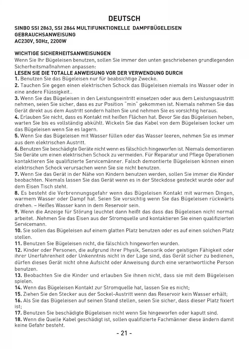 GEBRAUCHSANWEISUNG AC230V, 50Hz, 2200W WICHTIGE SICHERHEITSANWEISUNGEN Wenn Sie Ihr Bügeleisen benutzen, sollen Sie immer den unten geschriebenen grundlegenden Sicherheitsmaßnahmen anpassen: LESEN SIE DIE TOTALLE ANWEISUNG VOR DER VERWENDUNG DURCH