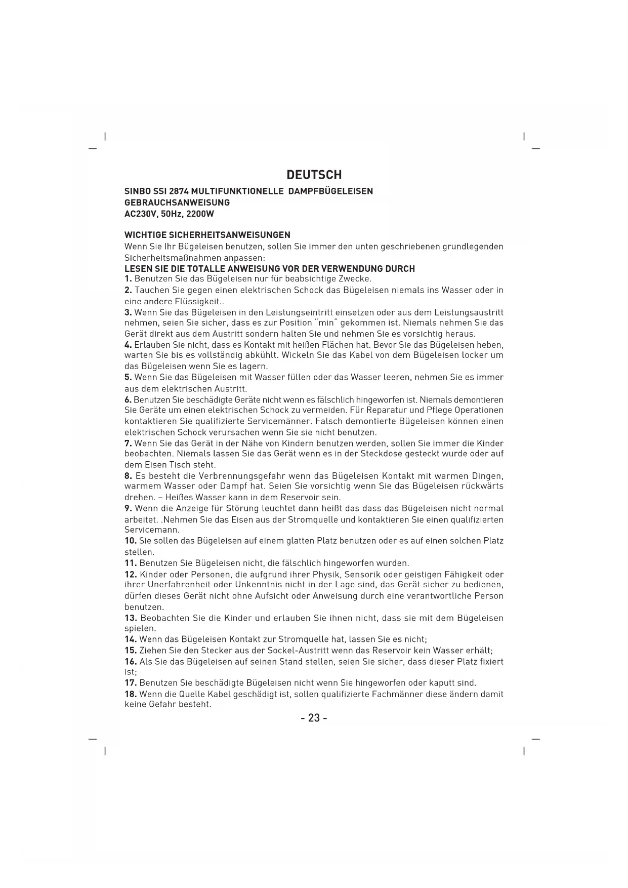 GEBRAUCHSANWEISUNG AC230V, 50Hz, 2200W WICHTIGE SICHERHEITSANWEISUNGEN Wenn Sie Ihr Bügeleisen benutzen, sollen Sie immer den unten geschriebenen grundlegenden Sicherheitsmaßnahmen anpassen: LESEN SIE DIE TOTALLE ANWEISUNG VOR DER VERWENDUNG DURCH