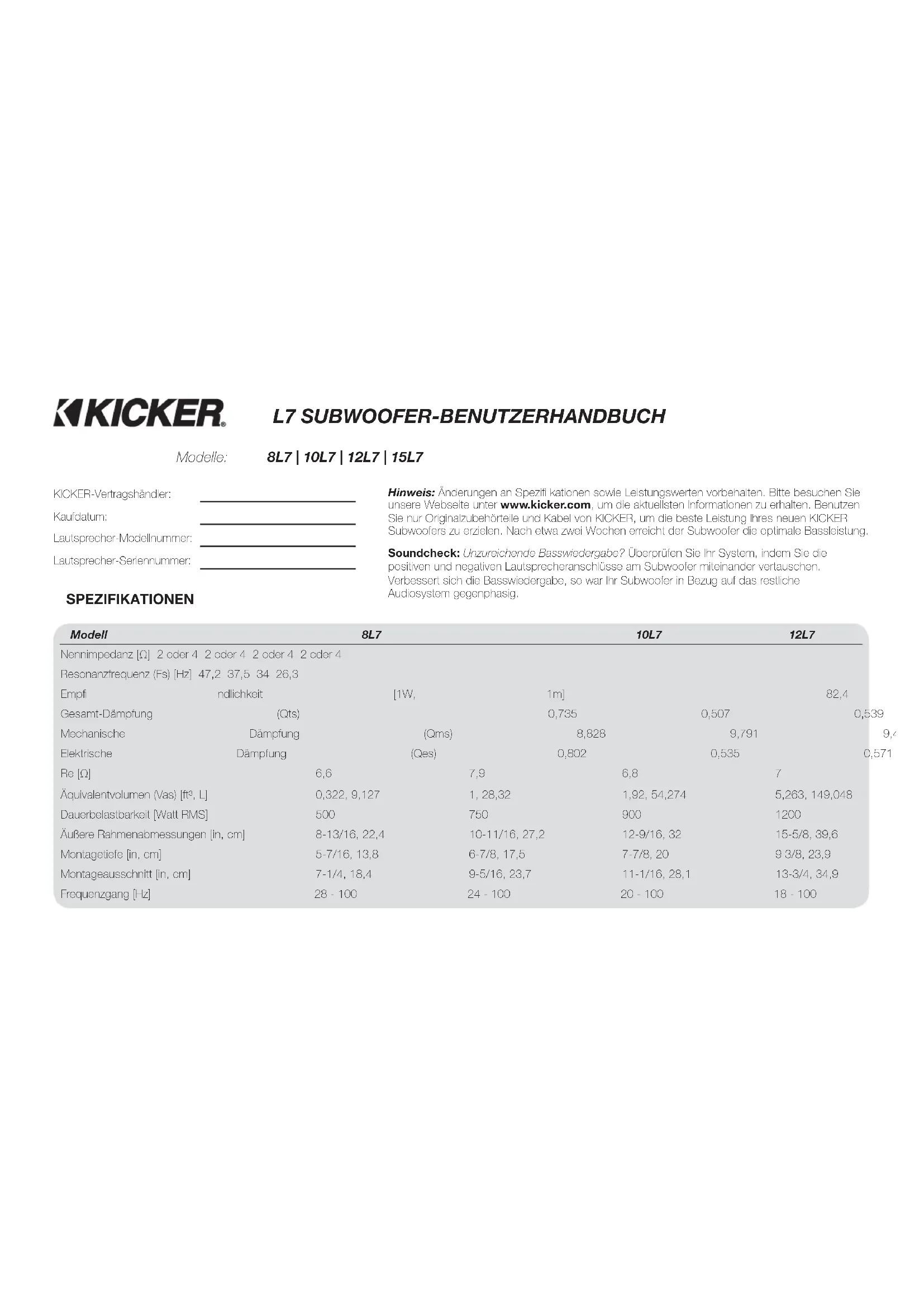 2015 L7 Subwoofers Manual Rev G.indd 172015 L7 Subwoofers Manual Rev G.indd 17 11/6/2014 9:25:58 AM11/6/2014 9:25:58 AMSPEZIFIKATIONEN L7 SUBWOOFER-BENUTZERHANDBUCH KICKER-Vertragshändler: Kaufdatum: Lautsprecher-Modellnummer: Lautsprecher-Seriennummer: Modell 8L7 10L7 12L7 15L7 Nennimpedanz [Ω] 2 oder 4 2 oder 4 2 oder 4 2 oder 4 Resonanzfrequenz (Fs) [Hz] 47,2 37,5 34 26,3 Empfi ndlichkeit [1W, 1m] 82,4 85,9 86,9 88,6 Gesamt-Dämpfung (Qts) 0,735 0,507 0,539 0,539 Mechanische Dämpfung (Qms) 8,828 9,791 9,488 11,868 Elektrische Dämpfung (Qes) 0,802 0,535 0,571 0,565 Re [Ω] 6,6 7,9 6,8 7 Äquivalentvolumen (Vas) [ft³, L] 0,322, 9,127 1, 28,32 1,92, 54,274 5,263, 149,048 Dauerbelastbarkeit [Watt RMS] 500 750 900 1200 Äußere Rahmenabmessungen [in, cm] 8-13/16, 22,4 10-11/16, 27,2 12-9/16, 32 15-5/8, 39,6 Montagetiefe [in, cm] 5-7/16, 13,8 6-7/8, 17,5 7-7/8, 20 9 3/8, 23,9 Montageausschnitt [in, cm] 7-1/4, 18,4 9-5/16, 23,7 11-1/16, 28,1 13-3/4, 34,9 Frequenzgang [Hz] 28 - 100 24 - 100 20 - 100 18 - 100 8L7 | 10L7 | 12L7 | 15L7Modelle: Hinweis: Änderungen an Spezifi kationen sowie Leistungswerten vorbehalten. Bitte besuchen Sie unsere Webseite unter www.kicker.com, um die aktuellsten Informationen zu erhalten. Benutzen Sie nur Originalzubehörteile und Kabel von KICKER, um die beste Leistung Ihres neuen KICKER Subwoofers zu erzielen. Nach etwa zwei Wochen erreicht der Subwoofer die optimale Bassleistung. Soundcheck: Unzureichende Basswiedergabe? Überprüfen Sie Ihr System, indem Sie die positiven und negativen Lautsprecheranschlüsse am Subwoofer miteinander vertauschen. Verbessert sich die Basswiedergabe, so war Ihr Subwoofer in Bezug auf das restliche Audiosystem gegenphasig. 2015 L7 Subwoofers Manual Rev G.indd 182015 L7 Subwoofers Manual Rev G.indd 18 11/6/2014 9:25:58 AM11/6/2014 9:25:58 AMElastomerische Einfassung mit variablem Querschnitt (Erweiterte Auslenkung) Blue-Lace