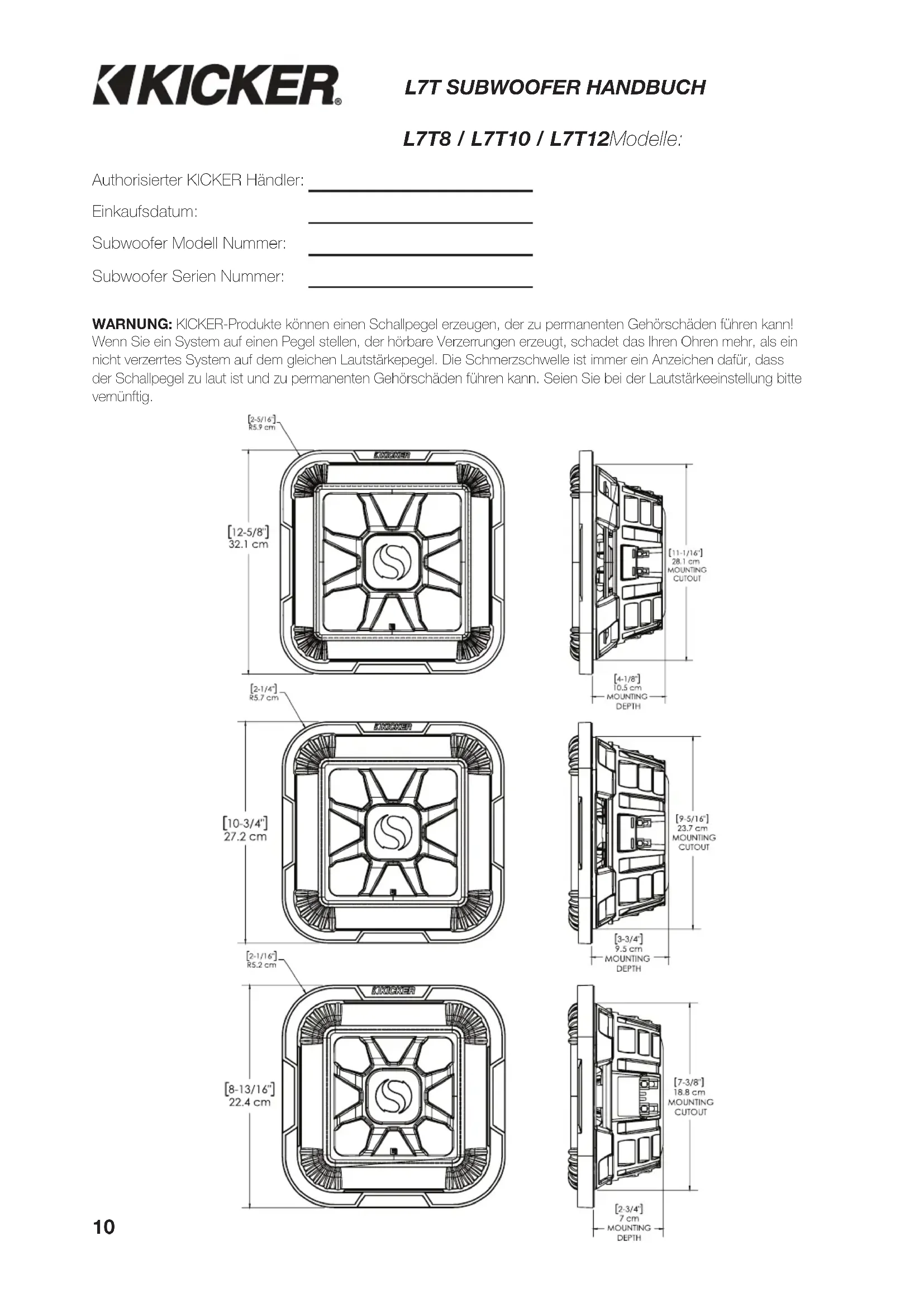 Authorisierter KICKER Händler: Einkaufsdatum: Subwoofer Modell Nummer: Subwoofer Serien Nummer: L7T8 / L7T10 / L7T12Modelle: WARNUNG: KICKER-Produkte können einen Schallpegel erzeugen, der zu permanenten Gehörschäden führen kann! Wenn Sie ein System auf einen Pegel stellen, der hörbare Verzerrungen erzeugt, schadet das Ihren Ohren mehr, als ein nicht verzerrtes System auf dem gleichen Lautstärkepegel. Die Schmerzschwelle ist immer ein Anzeichen dafür, dass der Schallpegel zu laut ist und zu permanenten Gehörschäden führen kann. Seien Sie bei der Lautstärkeeinstellung bitte vernünftig. 2019 L7T Rev D.indd 102019 L7T Rev D.indd 10 2/14/2019 9:50:15 AM2/14/2019 9:50:15 AM11 TECHNISCHE DATEN Modell L7T8 L7T10 L7T12 Nennimpedanz [Ω] 2 oder 4 2 oder 4 2 oder 4 Resonanzfrequenz (Fs) [Hz] 45,4 30,75 26,3 Empfohlene Verstärkerleistung [RMS Watt] 350 500 600 Dauerbelastbarkeit [Watt] 700 1000 1200 Empfi ndlichkeit [1W, 1m] 84,835 85,98 86,54 Xmax (Lineare Auslenkung) [mm] 7,25 9,2 10,25 Re [Ω] 7,37 7,42 7,14 Mechanische Dämpfung (Qms) 8,516 9,33 8,7605 Elektrische Dämpfung (Qes) 0,674 0,563 0,641 Gesamt-Dämpfung (Qts) 0,625 0,531 0,597 Mms [g] 99,385 175,13 242,952 Sd [cm