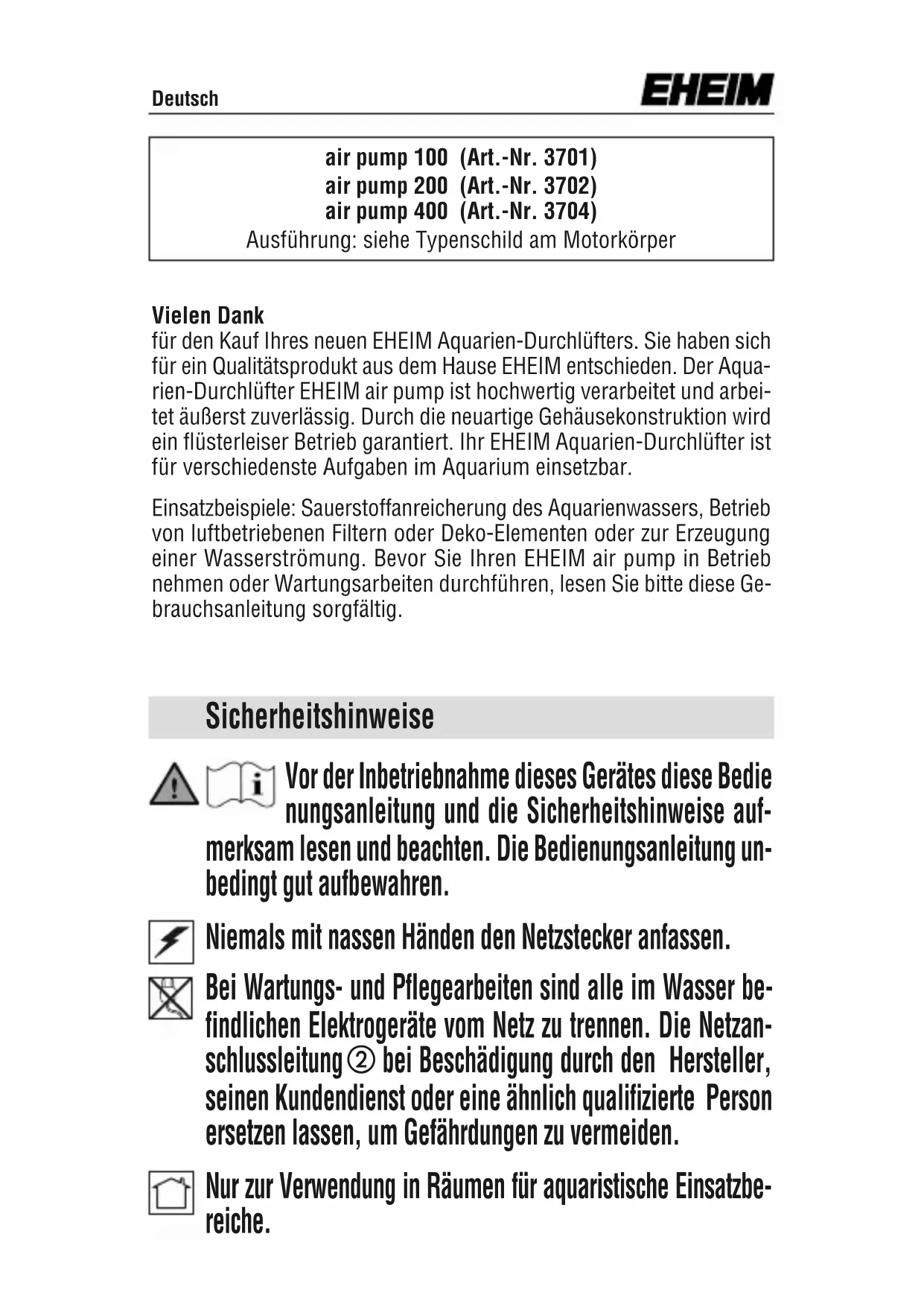 iDeutsch air pump 100 (Art.-Nr. 3701) air pump 200 (Art.-Nr. 3702) air pump 400 (Art.-Nr. 3704) Ausführung: siehe Typenschild am Motorkörper Vielen Dank für den Kauf Ihres neuen EHEIM Aquarien-Durchlüfters. Sie haben sich für ein Qualitätsprodukt aus dem Hause EHEIM entschieden. Der Aqua- rien-Durchlüfter EHEIM air pump ist hochwertig verarbeitet und arbei- tet äußerst zuverlässig. Durch die neuartige Gehäusekonstruktion wird ein flüsterleiser Betrieb garantiert. Ihr EHEIM Aquarien-Durchlüfter ist für verschiedenste Aufgaben im Aquarium einsetzbar. Einsatzbeispiele: Sauerstoffanreicherung des Aquarienwassers, Betrieb von luftbetriebenen Filtern oder Deko-Elementen oder zur Erzeugung einer Wasserströmung. Bevor Sie Ihren EHEIM air pump in Betrieb nehmen oder Wartungsarbeiten durchführen, lesen Sie bitte diese Ge- brauchsanleitung sorgfältig. Vor der Inbetriebnahme dieses Gerätes diese Bedie nungsanleitung und die Sicherheitshinweise auf- merksam lesen und beachten. Die Bedienungsanleitung un- bedingt gut aufbewahren. Niemals mit nassen Händen den Netzstecker anfassen. Bei Wartungs- und Pflegearbeiten sind alle im Wasser be- findlichen Elektrogeräte vom Netz zu trennen. Die Netzan- schlussleitung