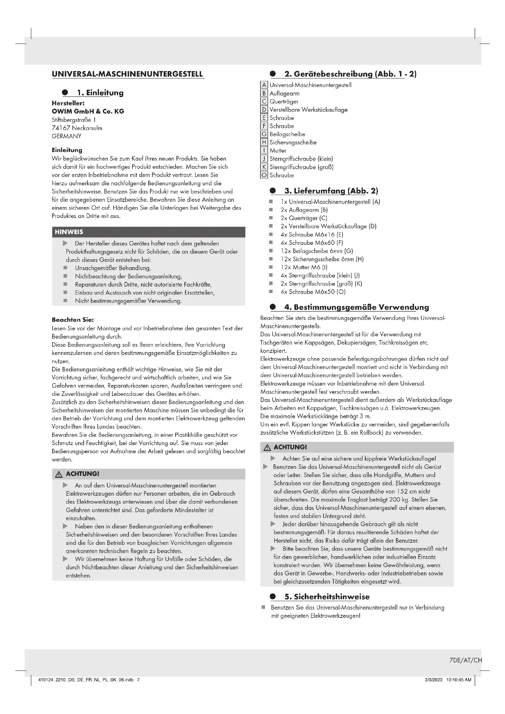ACHTUNG! u Achten Sie auf eine sichere und kippfreie Werkstückauflage! u Benutzen Sie das Universal-Maschinenuntergestell nicht als Gerüst oder Leiter. Stellen Sie sicher, dass alle Handgriffe, Muttern und Schrauben vor der Benutzung angezogen sind. Elektrowerkzeuge auf diesem Gerät, dürfen eine Gesamthöhe von 152 cm nicht überschreiten. Die maximale Traglast beträgt 200 kg. Stellen Sie sicher, dass das Universal-Maschinenuntergestell auf einem ebenen, festen und stabilen Untergrund steht. u Jeder darüber hinausgehende Gebrauch gilt als nicht bestimmungsgemäß. Für daraus resultierende Schäden haftet der Hersteller nicht, das Risiko dafür trägt allein der Benutzer. u Bitte beachten Sie, dass unsere Geräte bestimmungsgemäß nicht für den gewerblichen, handwerklichen oder industriellen Einsatz konstruiert wurden. Wir übernehmen keine Gewährleistung, wenn das Gerät in Gewerbe-, Handwerks- oder Industriebetrieben sowie bei gleichzusetzenden Tätigkeiten eingesetzt wird.