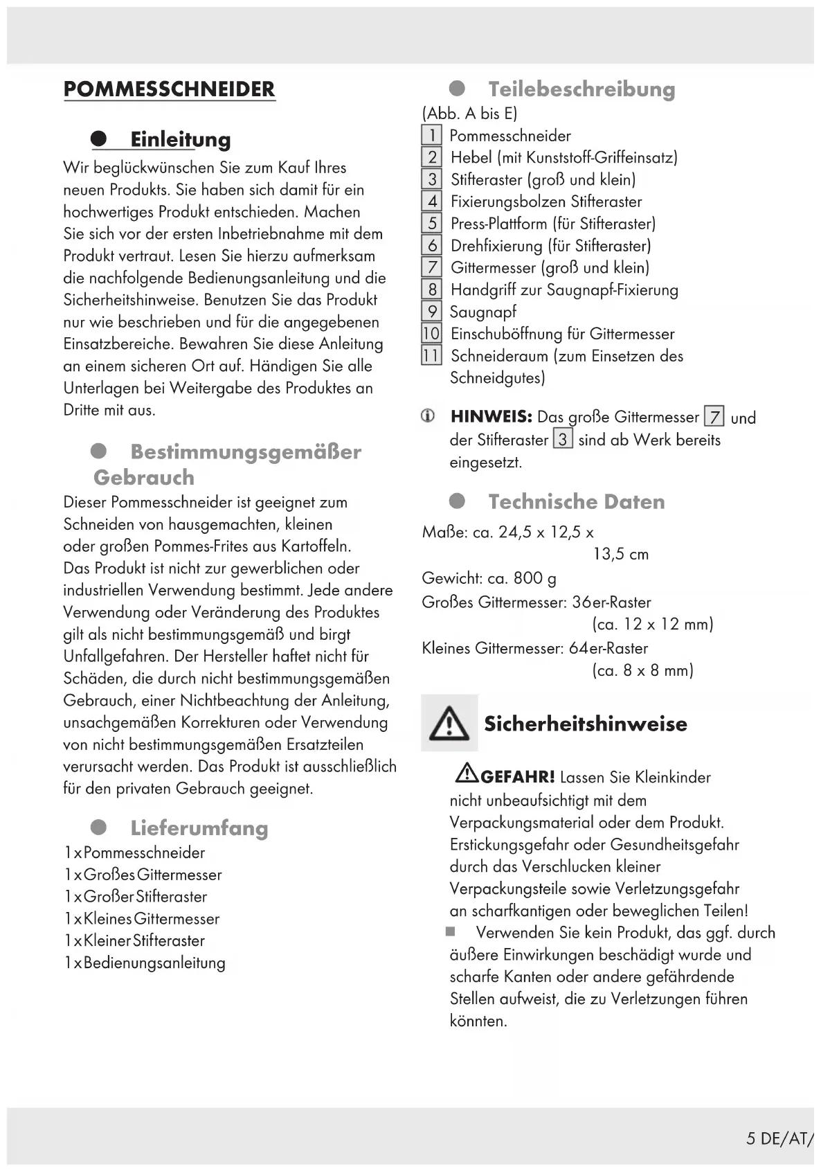 M5 DE/AT/CH POMMESSCHNEIDER Einleitung Wir beglückwünschen Sie zum Kauf Ihres neuen Produkts. Sie haben sich damit für ein hochwertiges Produkt entschieden. Machen Sie sich vor der ersten Inbetriebnahme mit dem Produkt vertraut. Lesen Sie hierzu aufmerksam die nachfolgende Bedienungsanleitung und die Sicherheitshinweise. Benutzen Sie das Produkt nur wie beschrieben und für die angegebenen Einsatzbereiche. Bewahren Sie diese Anleitung an einem sicheren Ort auf. Händigen Sie alle Unterlagen bei Weitergabe des Produktes an Dritte mit aus. Bestimmungsgemäßer Gebrauch Dieser Pommesschneider ist geeignet zum Schneiden von hausgemachten, kleinen oder großen Pommes-Frites aus Kartoffeln. Das Produkt ist nicht zur gewerblichen oder industriellen Verwendung bestimmt. Jede andere Verwendung oder Veränderung des Produktes gilt als nicht bestimmungsgemäß und birgt Unfallgefahren. Der Hersteller haftet nicht für Schäden, die durch nicht bestimmungsgemäßen Gebrauch, einer Nichtbeachtung der Anleitung, unsachgemäßen Korrekturen oder Verwendung von nicht bestimmungsgemäßen Ersatzteilen verursacht werden. Das Produkt ist ausschließlich für den privaten Gebrauch geeignet. Lieferumfang 1 x Pommesschneider 1 x Großes Gittermesser 1 x Großer Stifteraster 1 x Kleines Git termesser 1 x Kleiner Stif teraster 1 x Bedienungsanleitung Teilebeschreibung (Abb. A bis E)