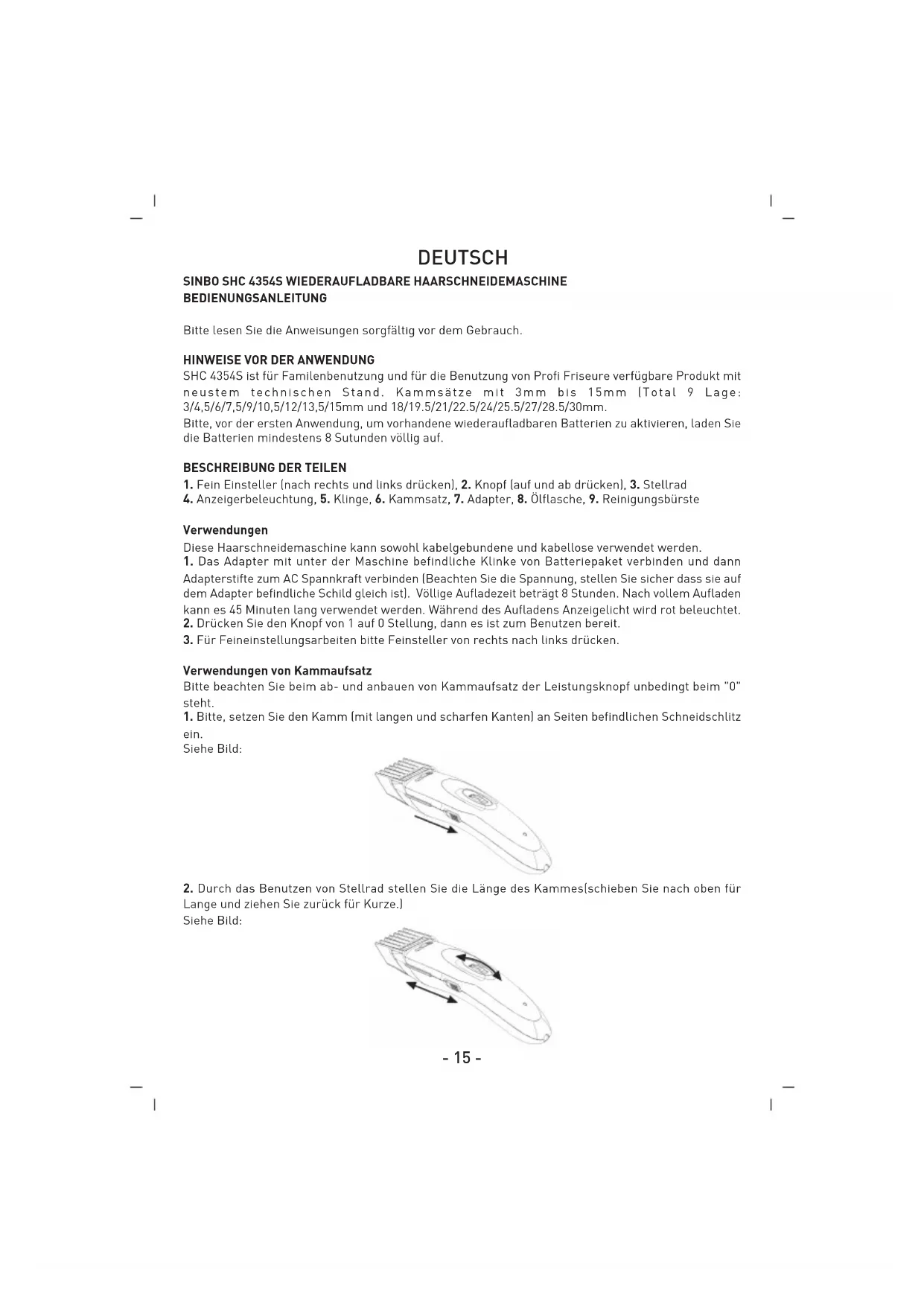 bis ein "KA" Klang zu hören ist. Beim Aufladen Wenn die Aussentemperatur unter 0°C oder über 40°C befindet, bitte nicht aufladen. Wenn es in einem Ort, wo Sonnenstrahlen direkt einwirkt oder Wärmequelle die Wärme emittiert, befindet, wird auch das Aufladen unterlassen. Standard Aufladezeit beträgt 8 Stunden. Zu Vermeidung der Batteriestörungen bitte Aufladezeit nicht verlängern. Warnungen Reinigen Sie den Rumpf sehr leicht mit Wasser oder mit weichem und Seifenwasser benetztem Tuch. Benutzen Sie absolut keine ätzende Lösung. Schere absolut nicht ins Wasser tauchen. Von der Kindern fern halten. Diese Schere kann während des Arbeitens und/oder des Aufladens warm werden, keine Sorge es ist völlig normal.- 17 - Um möglicher Schaden und der Unfälle beim Verwenden zu vermeiden, halten Sie das Gerät nicht in der Steckdose gesteckt. Die bewegliche Teile absolut nicht stochern. Technische Daten Ladezeit: 8 Stunden Arbeitszeit : 45 Minuten (bei vollen Ladung) Adapter Eingangspannung: AC100-240V, 50/60Hz Adapter Ausgangspannung: 3 VDC, 600mA Bitte Achtung: Nach der Lieferung, stellen Sie sicher dass innerhalb 1 Jahr mindestens 1 Mal aufgeladen ist. Benutzen dieses Gerätes von den physischen, sensorischen oder geistige Behinderten ist , ohne Aufsicht oder ohne Beisein eines verantwortlichen Persons für Sicherheit, untersagt. Das gilt auch für die Personen, die einen Mangel an Erfahrung und Wissen haben (einschliesslich Kinder); Um sicher zu stellen dass die Kinder mit dem Gerät nicht spielen, überwacht werden. Wegen unkontrollierter Abfallentsorgung wie unbenutzte Batterien und Motoren, um die Umweltschaden und menschlischen Gesundheitschaden zu vermeiden und um die nachhaltige Wiederverwertung von stofflichen Ressourcen, stellen Sie sicher, dass sie verantwortungsvoller Weise zur Wiederverwertung eingeführt werden. Um altes Gerät zur Wiederverwertung zu führen, wenden Sie sich an Rückgabe- und Sammel-stellen an oder setzen Sie sich mit der Händler in Verbindung. Sie können diese Produkte für Wiederverwertung aufnehmen. Sie dürfen für Bad- oder Brause-produkte nicht verwenden. VORSICHT: Das Gerät bitte trocken aufbewahren.- 18 - ESPANOL SINBO SHC 4354S MÁQUINA RECARGABLE CORTA PELO Por favor lea atentamente las siguientes instrucciones antes de usar este aparato.