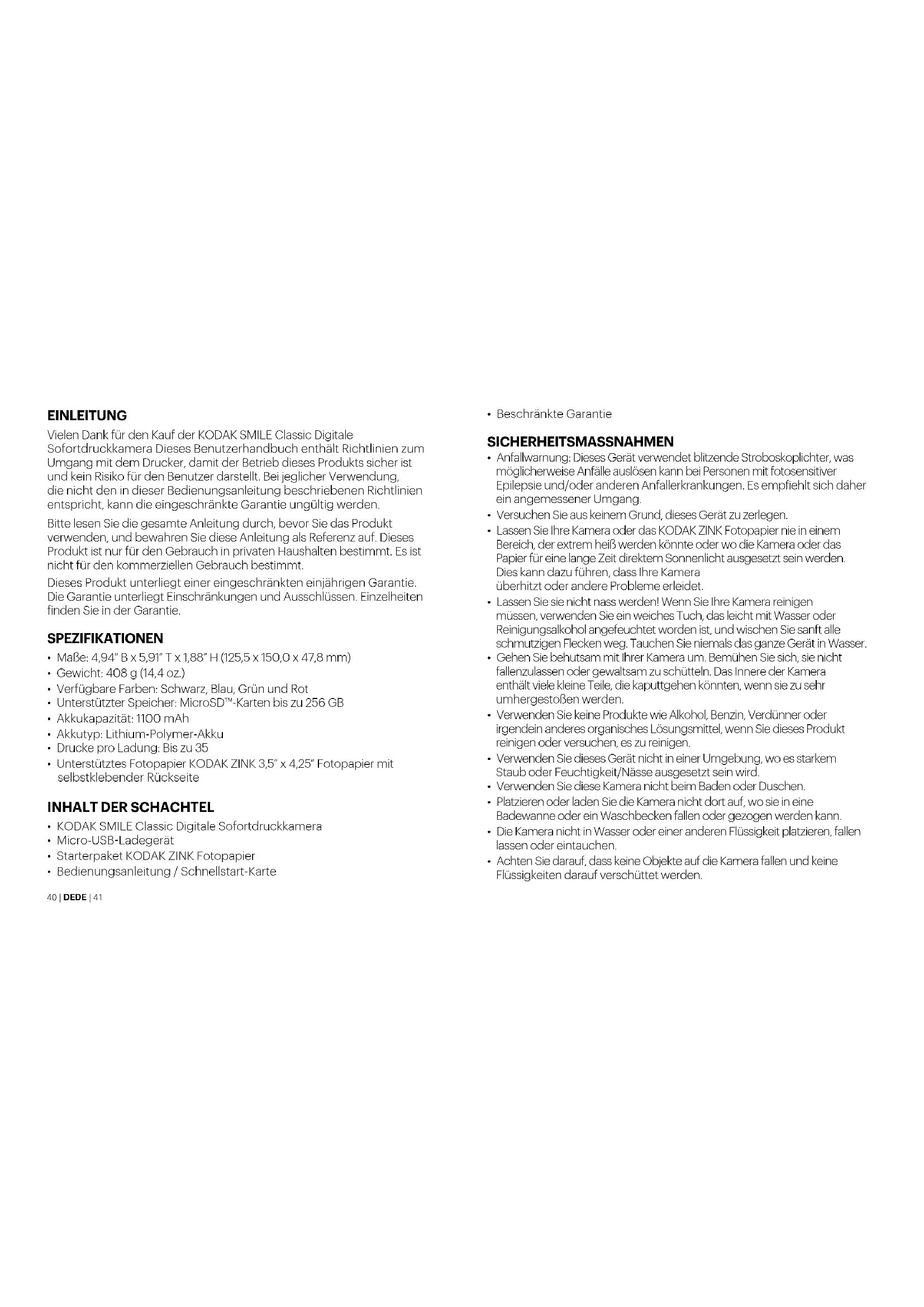 - Consulte al distribuidor o a un técnico de radio o televisión con experiencia para obtener ayuda. Precaución de la FCC: cualquier cambio o modiicación no aprobada expresamente por la parte responsable del cumplimiento podría anular la autoridad del usuario para manejar este equipo. Este transmisor no debe coubicarse ni funcionar junto con ninguna otra antena o transmisor. Declaración de exposición a la radiación: Este equipo cumple con los límites de exposición a la radiación establecidos por la FCC para un entorno no controlado.40 | DE DE | 41 EINLEITUNG Vielen Dank für den Kauf der KODAK SMILE Classic Digitale Sofortdruckkamera Dieses Benutzerhandbuch enthält Richtlinien zum Umgang mit dem Drucker, damit der Betrieb dieses Produkts sicher ist und kein Risiko für den Benutzer darstellt. Bei jeglicher Verwendung, die nicht den in dieser Bedienungsanleitung beschriebenen Richtlinien entspricht, kann die eingeschränkte Garantie ungültig werden. Bitte lesen Sie die gesamte Anleitung durch, bevor Sie das Produkt verwenden, und bewahren Sie diese Anleitung als Referenz auf. Dieses Produkt ist nur für den Gebrauch in privaten Haushalten bestimmt. Es ist nicht für den kommerziellen Gebrauch bestimmt. Dieses Produkt unterliegt einer eingeschränkten einjährigen Garantie. Die Garantie unterliegt Einschränkungen und Ausschlüssen. Einzelheiten inden Sie in der Garantie. SPEZIFIKATIONEN