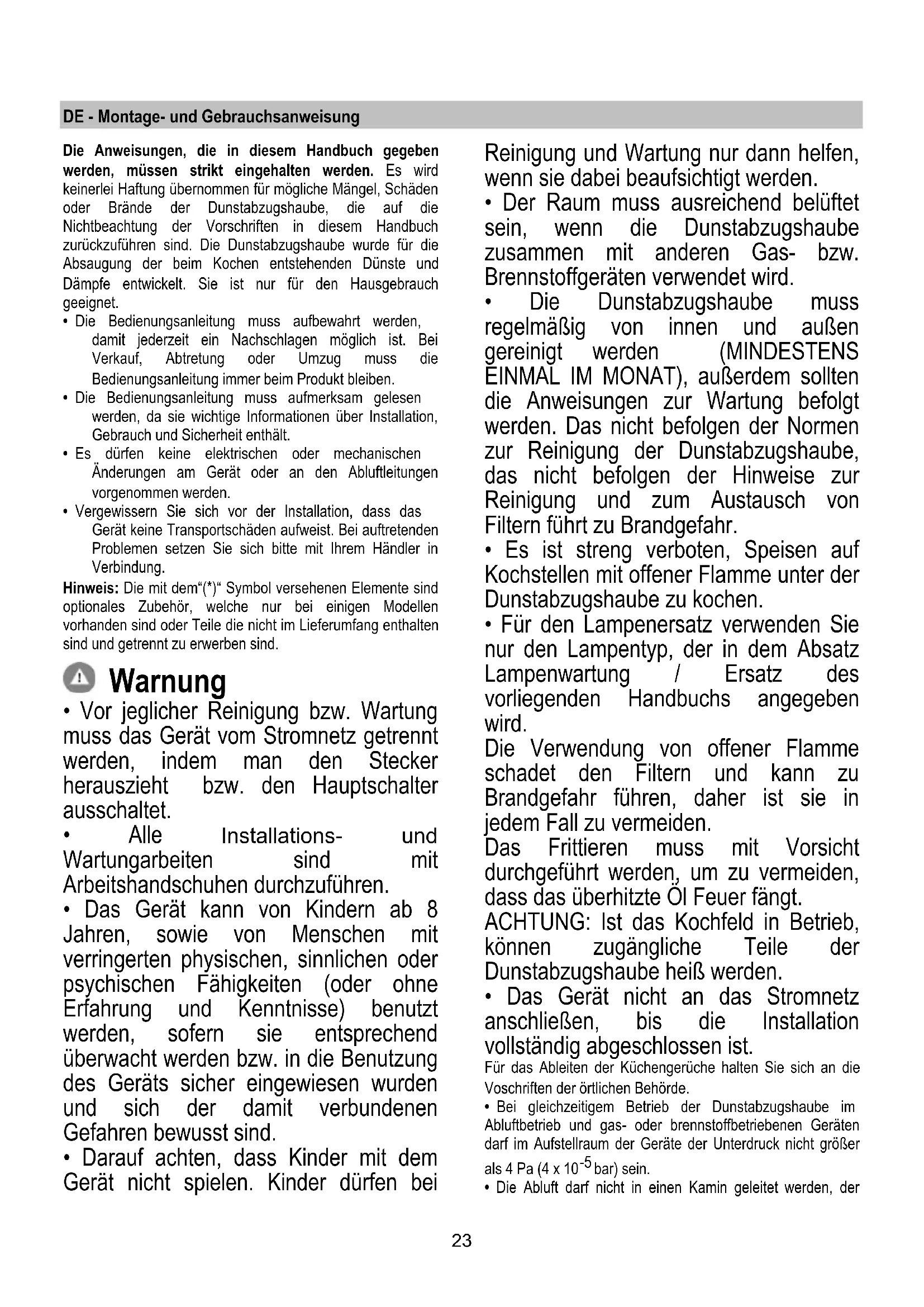 - Die Abluft darf nicht in einen Kamin geleitet werden, der24 zugleich Abgase von der Verbrennung von Gas oder anderen Brennstoffen führt.