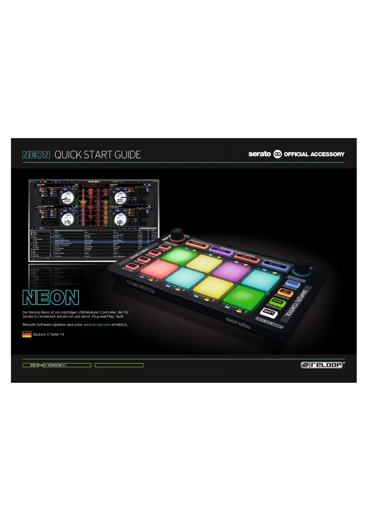 Der Reloop Neon ist ein mächtiger USB-Modular-Controller, der für Serato DJ entwickelt worden ist und damit ‚Plug-and-Play‘ läuft. Aktuelle Software Updates sind unter www.serato.com erhältlich. Deutsch // Seite 1-42 DEUTSCH VERISON 1.1