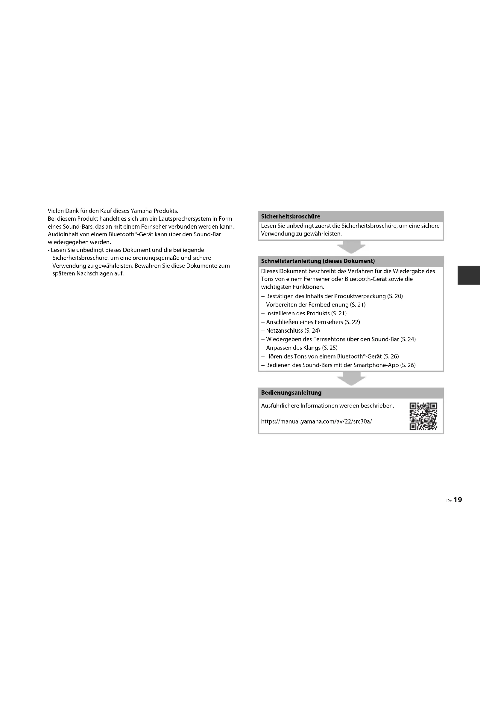 - Lesen Sie unbedingt dieses Dokument und die beiliegende Sicherheitsbroschüre, um eine ordnungsgemäße und sichere Verwendung zu gewährleisten. Bewahren Sie diese Dokumente zum späteren Nachschlagen auf. Sicherheitsbroschüre Lesen Sie unbedingt zuerst die Sicherheitsbroschüre, um eine sichere Verwendung zu gewährleisten. Schnellstartanleitung (dieses Dokument) Dieses Dokument beschreibt das Verfahren für die Wiedergabe des Tons von einem Fernseher oder Bluetooth-Gerät sowie die wichtigsten Funktionen. − Bestätigen des Inhalts der Produktverpackung (S. 20) − Vorbereiten der Fernbedienung (S. 21) − Installieren des Produkts (S. 21) − Anschließen eines Fernsehers (S. 22) − Netzanschluss (S. 24) − Wiedergeben des Fernsehtons über den Sound-Bar (S. 24) − Anpassen des Klangs (S. 25) − Hören des Tons von einem Bluetooth®-Gerät (S. 26) − Bedienen des Sound-Bars mit der Smartphone-App (S. 26) Bedienungsanleitung Ausführlichere Informationen werden beschrieben. https://manual.yamaha.com/av/22/src30a/ Schnellstartanleitung DE20 De Dieses Produkt umfasst die folgenden Hauptgeräte und Zubehörteile. Nehmen Sie alle Gegenstände aus dem Karton und vergewissern Sie sich, dass sie vollständig vorhanden sind. Bestätigen des Inhalts der Produktverpackung Sound-Bar (SR-CUC30A) Fernbedienung Optisch digitales Audiokabel Netzkabel (×2) Montageschablone Abstandhalter (A: ×2, B: ×2, auf 1 Blatt) HINWEIS
