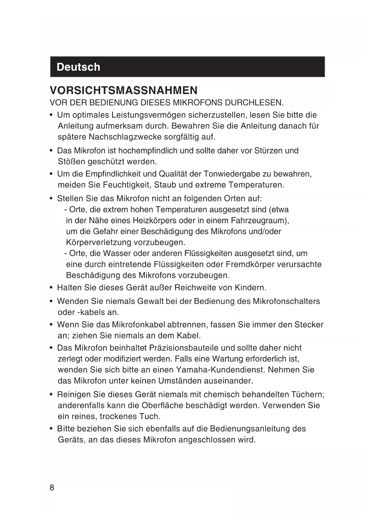 - Das Mikrofon beinhaltet Präzisionsbauteile und sollte daher nicht zerlegt oder modiziert werden. Falls eine Wartung erforderlich ist, wenden Sie sich bitte an einen Yamaha-Kundendienst. Nehmen Sie das Mikrofon unter keinen Umständen auseinander.