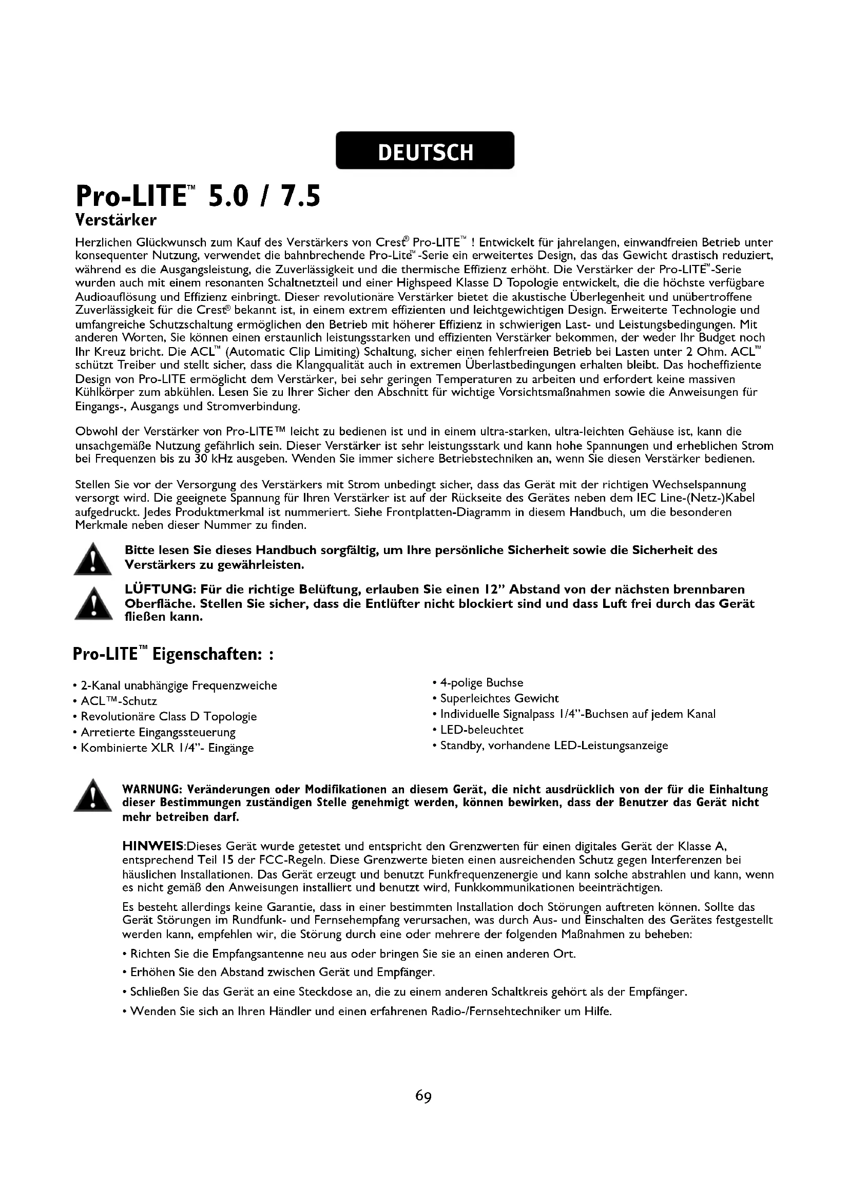 BEDIENUNGSANLEITUNG ProLITE 7.5 CREST AUDIO