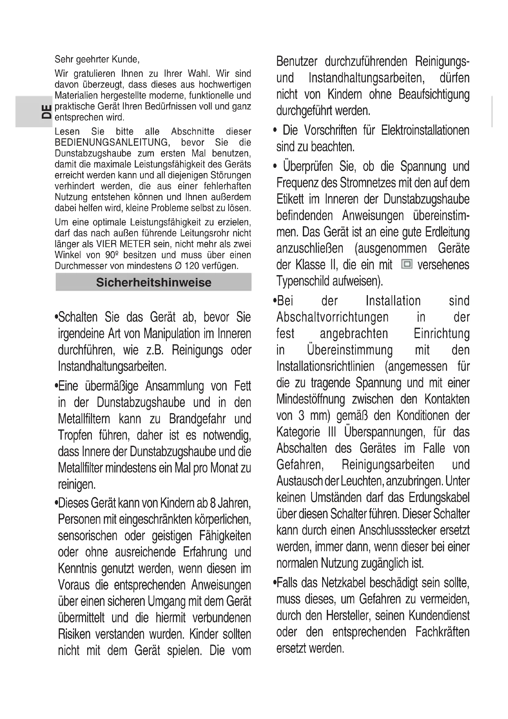 - Ihre Dunstabzugshaube ist für den häuslichen Gebrauch und einzig für den Abzug und die Reinigung von bei der Zubereitung von Lebensmittel entstandenen Gasen bestimmt. Der Einsatz der Dunstabzugshaube für andere Zwecke unterliegt Ihrer alleinigen Verantwortlichkeit und kann gefährlich sein. Der Hersteller übernimmt keine Verantwortung für Schäden, die aus einer unsachgemäßen Nutzung des Geräts entstehen.
