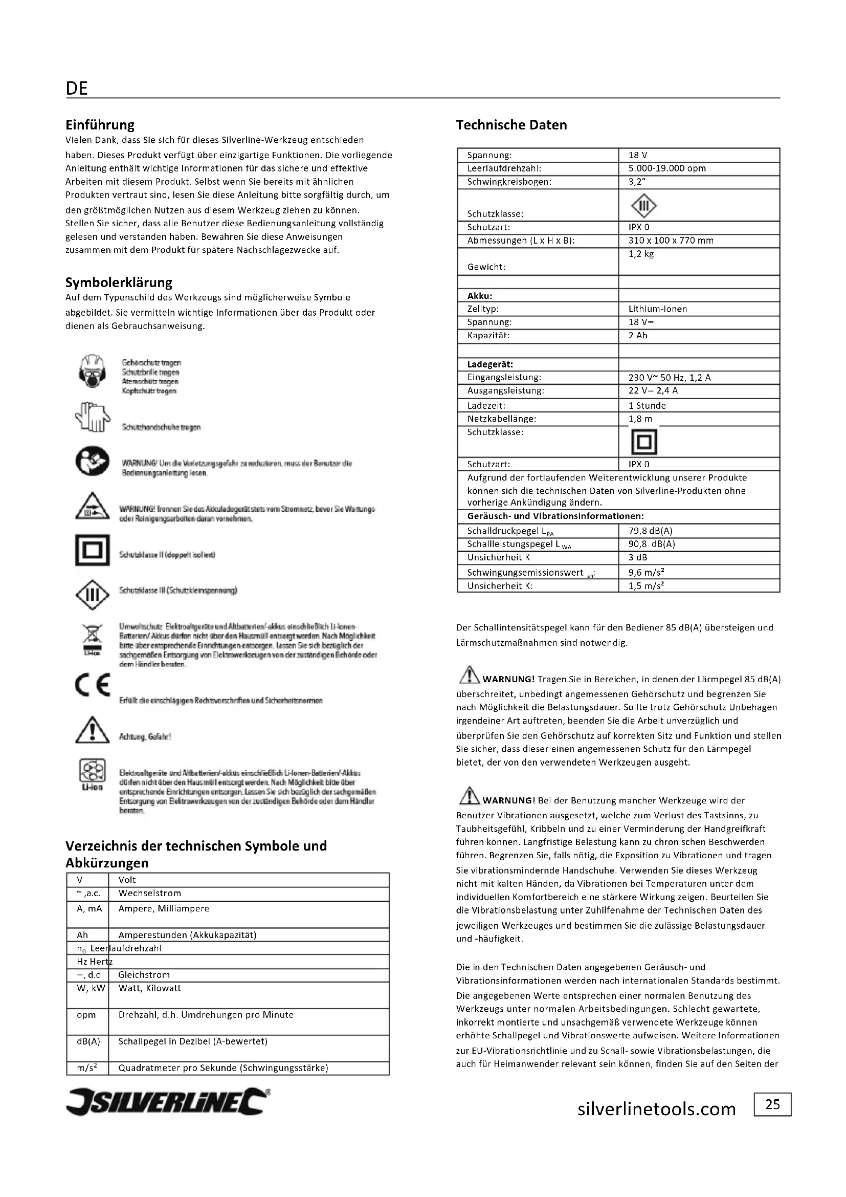 Quadratmeter#pro#Sekunde#(Schwingungsstärke)# Technische*Daten* Spannung:# 18#V## Leerlaufdrehzahl:# 5.000-19.000#opm Schwingkreisbogen:# 3,2°# Schutzklasse:# Schutzart:# IPX#0# Abmessungen#(L#x#H#x#B):# 310#x#100#x#770#mm# Gewicht:# 1,2#kg# Akku:# Zelltyp:# Lithium-Ione n # Spannung:# 18#V⎓## Kapazität:# 2#Ah# Ladegerät:# Eingangsleistung:# 230#V~*50#Hz,#1,2#A# Ausgangsleistung:# 22#V⎓#2,4#A# Ladezeit:# 1#Stunde# Netzkabellänge:# 1,8#m# Schutzklasse:# Schutzart:# IPX#0# Aufgrund#der#fortlaufenden#Weiterentwicklung#unserer#Produkte# können#sich#die#technischen#Daten#von#Silverline-Produkten#ohne# vorherige#Ankündigung#ändern.# Geräusch-*und*Vibrationsinformationen:# Schalldruckpegel#L #PA