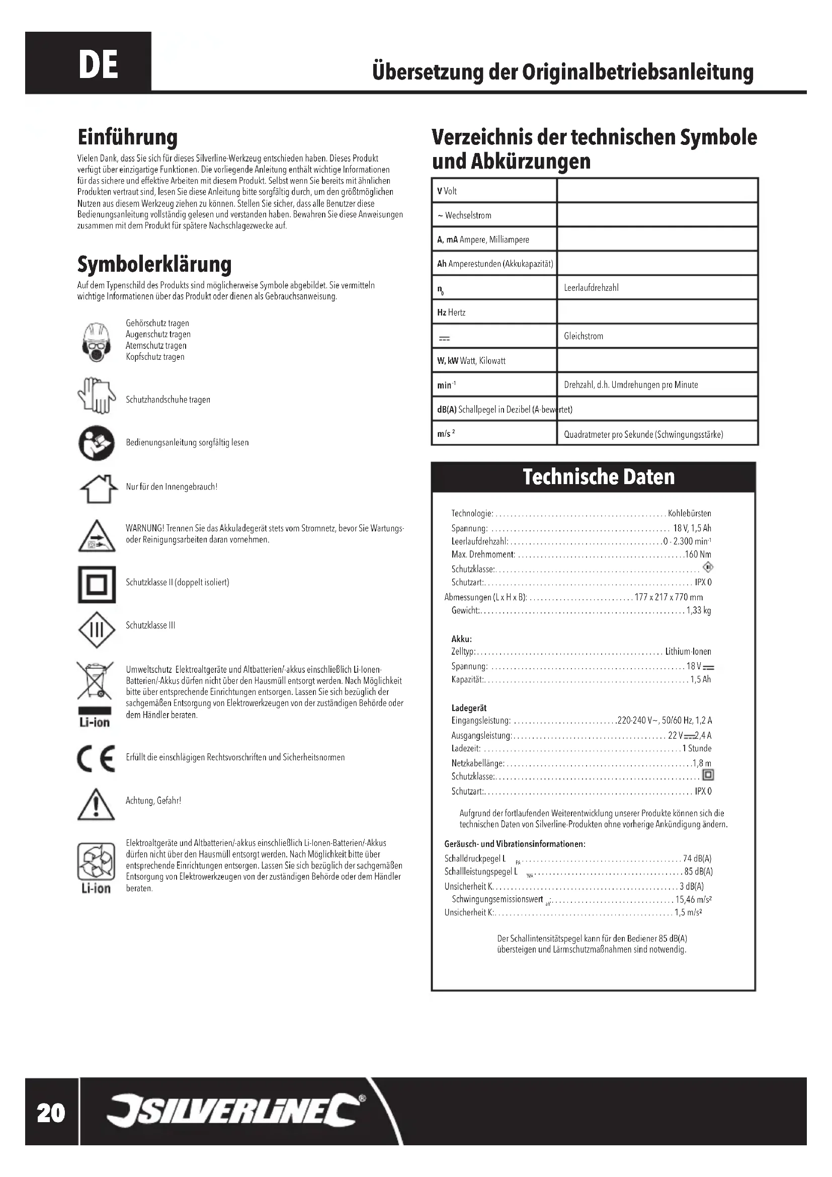 Übersetzung der Originalbetriebsanleitung Symbolerklärung AufdemTypenschilddesProduktssindmöglicherweiseSymboleabgebildet.SievermittelnwichtigeInformationenüberdasProduktoderdienenalsGebrauchsanweisung.Gehörschutz tragen Augenschutz tragenAtemschutz tragenKopfschutz tragenSchutzhandschuhe tragenBedienungsanleitung sorgfältig lesenNurfürdenInnengebrauch!WARNUNG! Trennen Sie das Akkuladegerät stets vom Stromnetz, bevor Sie Wartungs- oder Reinigungsarbeiten daran vornehmen.Schutzklasse II (doppelt isoliert)Schutzklasse IIIUmweltschutzElektroaltgeräteundAltbatterien/-akkuseinschließlichLi-Ionen-Batterien/-AkkusdürfennichtüberdenHausmüllentsorgtwerden.NachMöglichkeitbitteüberentsprechendeEinrichtungenentsorgen.LassenSiesichbezüglichdersachgemäßenEntsorgungvonElektrowerkzeugenvonderzuständigenBehördeoderdem Händler beraten.ErfülltdieeinschlägigenRechtsvorschriftenundSicherheitsnormenAchtung, Gefahr!ElektroaltgeräteundAltbatterien/-akkuseinschließlichLi-Ionen-Batterien/-AkkusdürfennichtüberdenHausmüllentsorgtwerden.NachMöglichkeitbitteüberentsprechendeEinrichtungenentsorgen.LassenSiesichbezüglichdersachgemäßenEntsorgungvonElektrowerkzeugenvonderzuständigenBehördeoderdemHändlerberaten. Einführung VielenDank,dassSiesichfürdiesesSilverline-Werkzeugentschiedenhaben.DiesesProduktverfügtübereinzigartigeFunktionen.DievorliegendeAnleitungenthältwichtigeInformationenfürdassichereundeffektiveArbeitenmitdiesemProdukt.SelbstwennSiebereitsmitähnlichenProduktenvertrautsind,lesenSiedieseAnleitungbittesorgfältigdurch,umdengrößtmöglichenNutzen aus diesem Werkzeug ziehen zu können. Stellen Sie sicher, dass alle Benutzer diese Bedienungsanleitungvollständiggelesenundverstandenhaben.BewahrenSiedieseAnweisungenzusammenmitdemProduktfürspätereNachschlagezweckeauf.