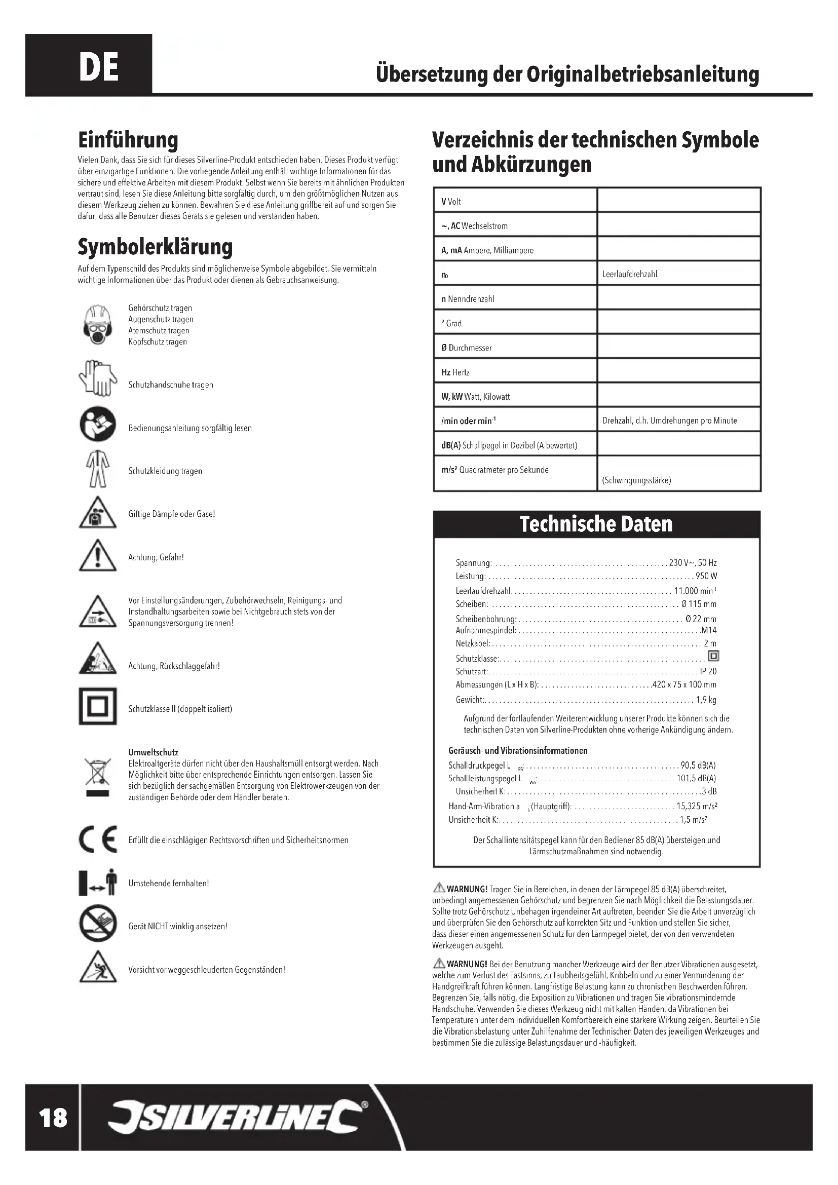 Scheiben: ..................................................Ø 115 mm Scheibenbohrung:............................................ Ø 22 mm Aufnahmespindel: . . . . . . . . . . . . . . . . . . . . . . . . . . . . . . . . . . . . . . . . . . . . . . . . .M14 Netzkabel:........................................................2 m Schutzklasse:....................................................... Schutzart:........................................................IP 20 Abmessungen (L x H x B): ..............................420 x 75 x 100 mm Gewicht:........................................................1,9 kg AufgrundderfortlaufendenWeiterentwicklungunsererProduktekönnensichdietechnischen Daten von Silverline-Produkten ohne vorherige Ankündigung ändern. Geräusch- und Vibrationsinformationen Schalldruckpegel L : .........................................90,5 dB(A) Schallleistungspegel L : ....................................101,5 dB(A) Unsicherheit K:....................................................3 dB Hand-Arm-Vibration a (Hauptgriff): ...........................15,325 m/s² Unsicherheit K:................................................1,5 m/s²Der Schallintensitätspegel kann für den Bediener 85 dB(A) übersteigen und Lärmschutzmaßnahmensindnotwendig. Technische Daten WARNUNG! Tragen Sie in Bereichen, in denen der Lärmpegel 85 dB(A) überschreitet, unbedingtangemessenenGehörschutzundbegrenzenSienachMöglichkeitdieBelastungsdauer.SolltetrotzGehörschutzUnbehagenirgendeinerArtauftreten,beendenSiedieArbeitunverzüglichundüberprüfenSiedenGehörschutzaufkorrektenSitzundFunktionundstellenSiesicher,dassdiesereinenangemessenenSchutzfürdenLärmpegelbietet,dervondenverwendetenWerkzeugen ausgeht. WARNUNG! BeiderBenutzungmancherWerkzeugewirdderBenutzerVibrationenausgesetzt, welchezumVerlustdesTastsinns,zuTaubheitsgefühl,KribbelnundzueinerVerminderungderHandgreifkraftführenkönnen.LangfristigeBelastungkannzuchronischenBeschwerdenführen.BegrenzenSie,fallsnötig,dieExpositionzuVibrationenundtragenSievibrationsminderndeHandschuhe.VerwendenSiediesesWerkzeugnichtmitkaltenHänden,daVibrationenbeiTemperaturen unter dem individuellen Komfortbereich eine stärkere Wirkung zeigen. Beurteilen Sie dieVibrationsbelastungunterZuhilfenahmederTechnischenDatendesjeweiligenWerkzeugesundbestimmenSiediezulässigeBelastungsdauerund-häugkeit. Symbolerklärung AufdemTypenschilddesProduktssindmöglicherweiseSymboleabgebildet.SievermittelnwichtigeInformationenüberdasProduktoderdienenalsGebrauchsanweisung.GehörschutztragenAugenschutz tragenAtemschutz tragenKopfschutz tragenSchutzhandschuhe tragenBedienungsanleitung sorgfältig lesenSchutzkleidung tragenGiftige Dämpfe oder Gase!Achtung, Gefahr!VorEinstellungsänderungen,Zubehörwechseln,Reinigungs-undInstandhaltungsarbeitensowiebeiNichtgebrauchstetsvonderSpannungsversorgung trennen!Achtung, Rückschlaggefahr!Schutzklasse II (doppelt isoliert)Umweltschutz ElektroaltgerätedürfennichtüberdenHaushaltsmüllentsorgtwerden.NachMöglichkeitbitteüberentsprechendeEinrichtungenentsorgen.LassenSiesichbezüglichdersachgemäßenEntsorgungvonElektrowerkzeugenvonderzuständigenBehördeoderdemHändlerberaten.Erfüllt die einschlägigen Rechtsvorschriften und SicherheitsnormenUmstehende fernhalten!GerätNICHTwinkligansetzen!VorsichtvorweggeschleudertenGegenständen! Einführung Vielen Dank, dass Sie sich für dieses Silverline-Produkt entschieden haben. Dieses Produkt verfügt übereinzigartigeFunktionen.DievorliegendeAnleitungenthältwichtigeInformationenfürdassichereundeffektiveArbeitenmitdiesemProdukt.SelbstwennSiebereitsmitähnlichenProduktenvertrautsind,lesenSiedieseAnleitungbittesorgfältigdurch,umdengrößtmöglichenNutzenausdiesemWerkzeugziehenzukönnen.BewahrenSiedieseAnleitunggriffbereitaufundsorgenSiedafür, dass alle Benutzer dieses Geräts sie gelesen und verstanden haben. Übersetzung der Originalbetriebsanleitung V Volt~, AC WechselstromA, mA Ampere, Milliampere