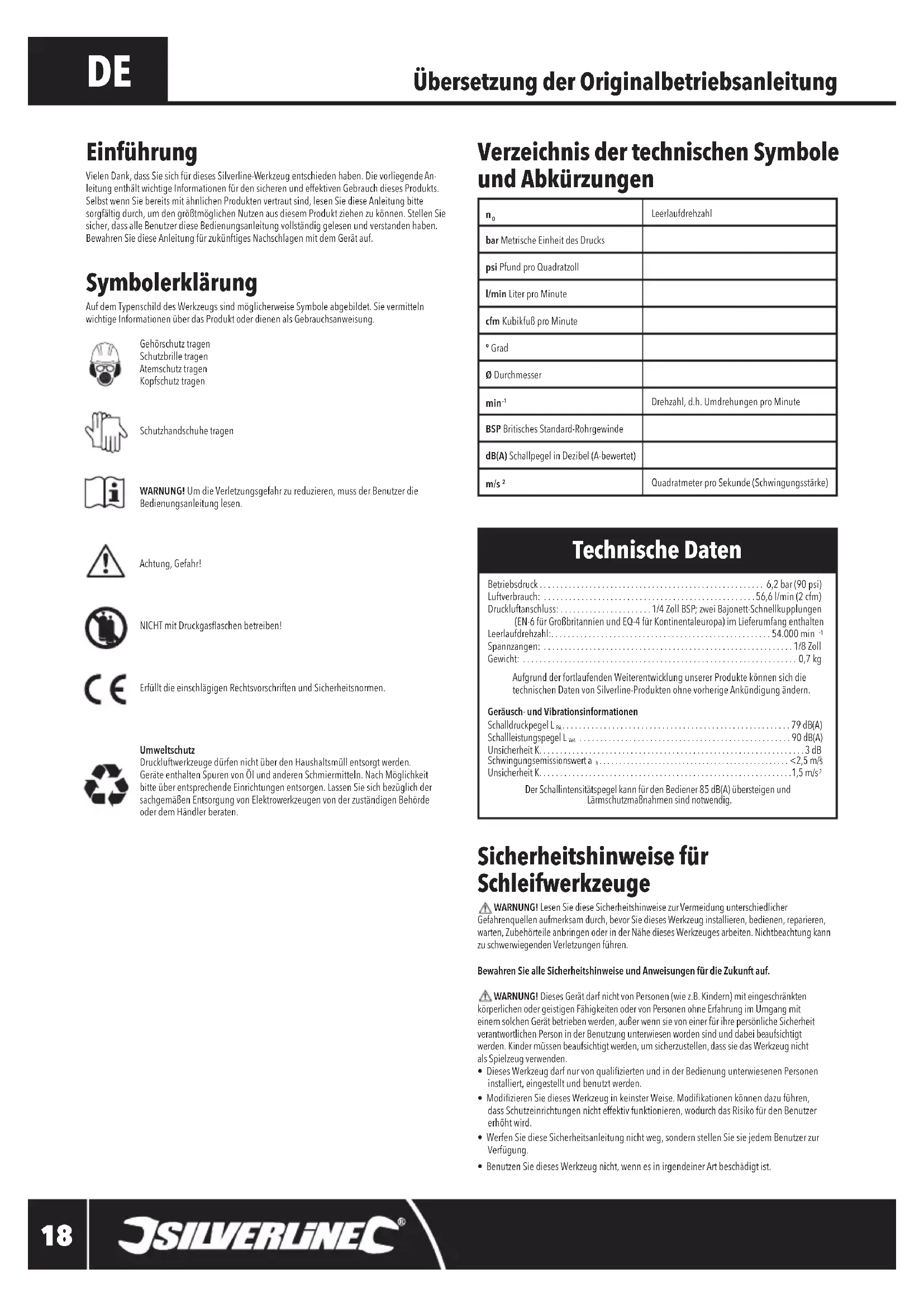 DerSchallintensitätspegelkannfürdenBediener85dB(A)übersteigenund Lärmschutzmaßnahmensindnotwendig. Einführung VielenDank,dassSiesichfürdiesesSilverline-Werkzeugentschiedenhaben.DievorliegendeAn- leitungenthältwichtigeInformationenfürdensicherenundeffektivenGebrauchdiesesProdukts.SelbstwennSiebereitsmitähnlichenProduktenvertrautsind,lesenSiedieseAnleitungbittesorgfältigdurch,umdengrößtmöglichenNutzenausdiesemProduktziehenzukönnen.StellenSiesicher,dassalleBenutzerdieseBedienungsanleitungvollständiggelesenundverstandenhaben.BewahrenSiedieseAnleitungfürzukünftigesNachschlagenmitdemGerätauf. Technische Daten 633630_OwnerManual.indd 18633630_OwnerManual.indd 18 12/10/2023 14:5112/10/2023 14:51Mini-Druckluft-Stabschleifer mit Zubehör633630