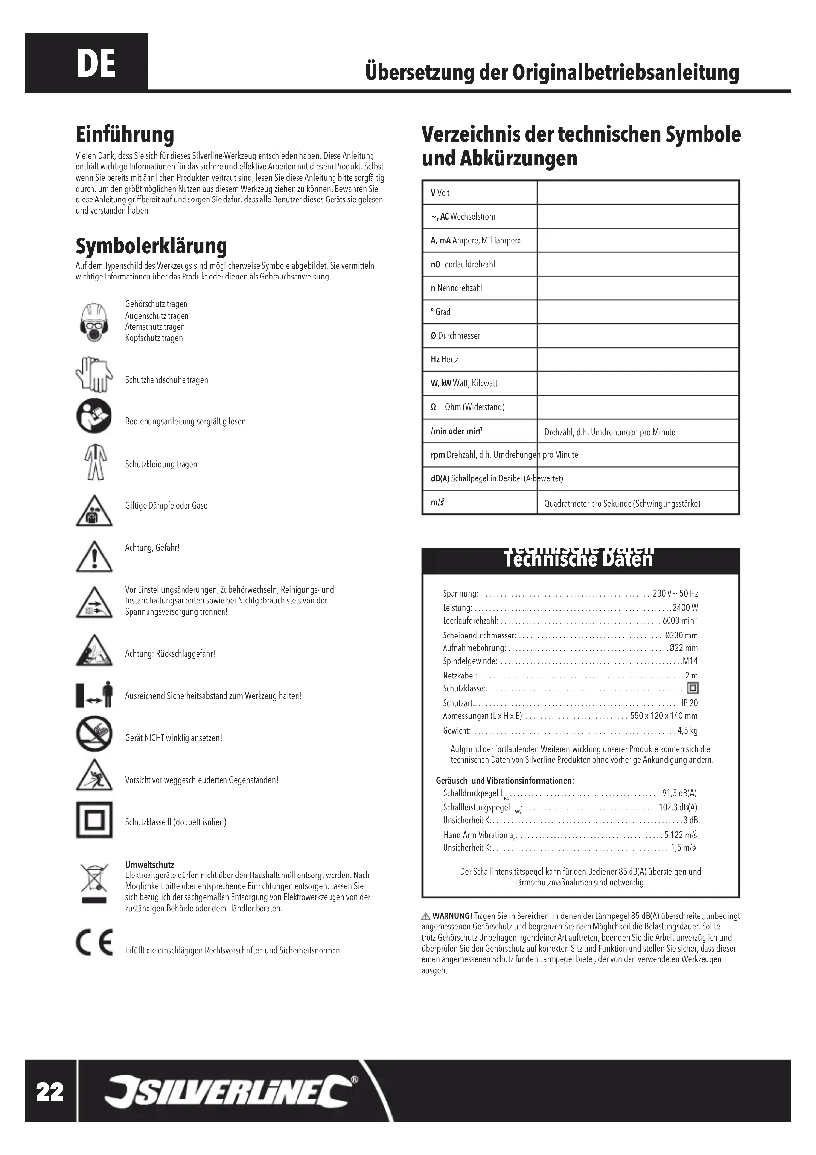 WARNUNG! TragenSieinBereichen,indenenderLärmpegel85dB(A)überschreitet,unbedingt angemessenenGehörschutzundbegrenzenSienachMöglichkeitdieBelastungsdauer.Sollte trotzGehörschutzUnbehagenirgendeinerArtauftreten,beendenSiedieArbeitunverzüglichund überprüfenSiedenGehörschutzaufkorrektenSitzundFunktionundstellenSiesicher,dassdieser einenangemessenenSchutzfürdenLärmpegelbietet,dervondenverwendetenWerkzeugen ausgeht. Übersetzung der Originalbetriebsanleitung Verzeichnis der technischen Symbole und Abkürzungen Symbolerklärung AufdemTypenschilddesWerkzeugssindmöglicherweiseSymboleabgebildet.Sievermitteln wichtigeInformationenüberdasProduktoderdienenalsGebrauchsanweisung. Gehörschutztragen Augenschutz tragen Atemschutz tragen Kopfschutz tragen Schutzhandschuhe tragen Bedienungsanleitungsorgfältiglesen Schutzkleidung tragen GiftigeDämpfeoderGase! Achtung,Gefahr! VorEinstellungsänderungen,Zubehörwechseln,Reinigungs-und InstandhaltungsarbeitensowiebeiNichtgebrauchstetsvonder Spannungsversorgungtrennen! Achtung:Rückschlaggefahr! AusreichendSicherheitsabstandzumWerkzeughalten! GerätNICHTwinkligansetzen! VorsichtvorweggeschleudertenGegenständen! SchutzklasseII(doppeltisoliert) Umweltschutz ElektroaltgerätedürfennichtüberdenHaushaltsmüllentsorgtwerden.Nach MöglichkeitbitteüberentsprechendeEinrichtungenentsorgen.LassenSie sichbezüglichdersachgemäßenEntsorgungvonElektrowerkzeugenvonder zuständigenBehördeoderdemHändlerberaten. ErfülltdieeinschlägigenRechtsvorschriftenundSicherheitsnormen Einführung VielenDank,dassSiesichfürdiesesSilverline-Werkzeugentschiedenhaben.DieseAnleitung enthältwichtigeInformationenfürdassichereundeffektiveArbeitenmitdiesemProdukt.Selbst wennSiebereitsmitähnlichenProduktenvertrautsind,lesenSiedieseAnleitungbittesorgfältig durch,umdengrößtmöglichenNutzenausdiesemWerkzeugziehenzukönnen.BewahrenSie dieseAnleitunggriffbereitaufundsorgenSiedafür,dassalleBenutzerdiesesGerätssiegelesen undverstandenhaben. Technische Daten