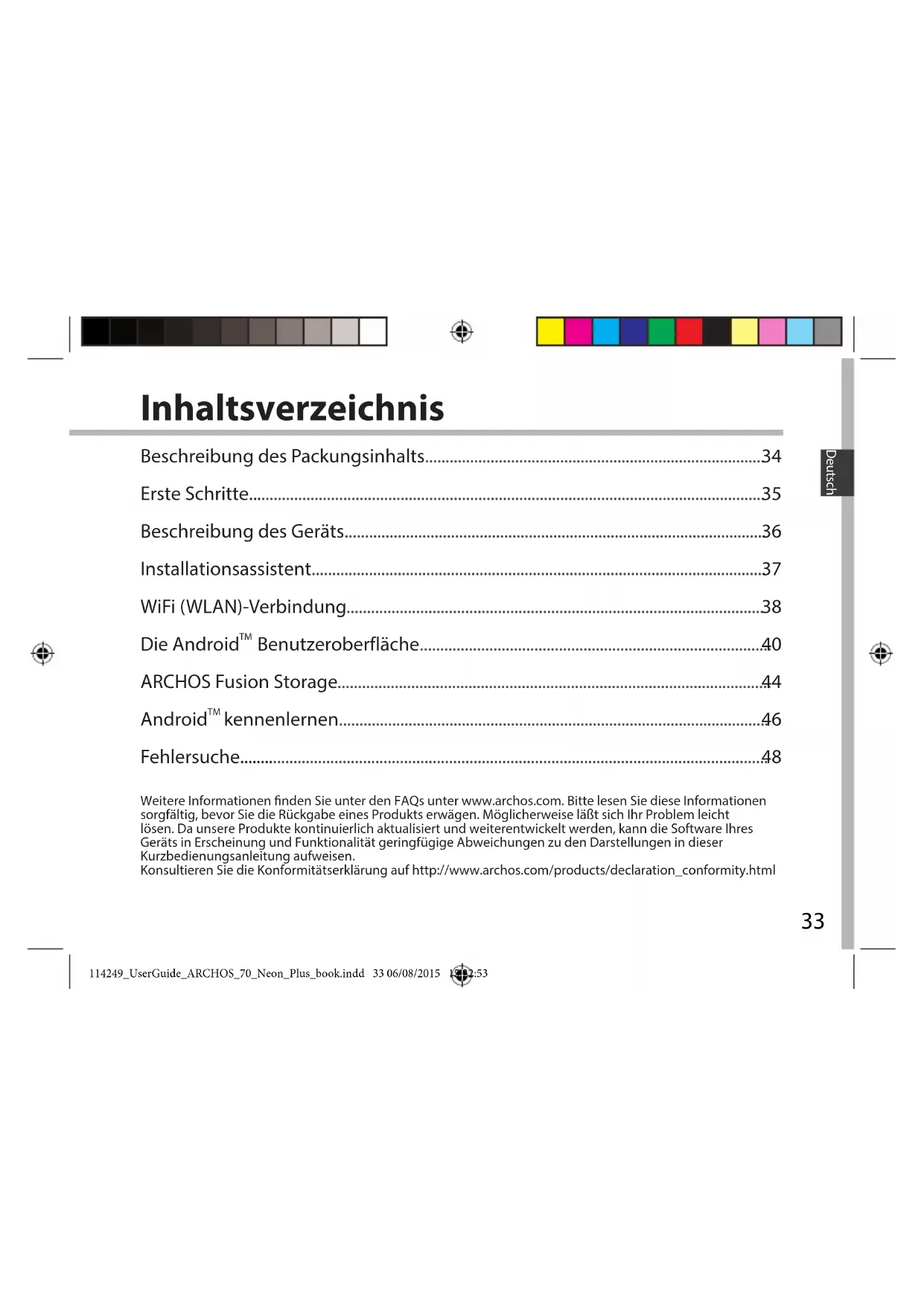 114249_UserGuide_ARCHOS_70_Neon_Plus_book.indd 33 06/08/2015 15:22:5334 Warranty Beschreibung des Packungsinhalts USB Kabel Ladegerät Benutzerhandbuch Garantie, Impressum und Sicherheitshinweise ARCHOS 70 Neon + 114249_UserGuide_ARCHOS_70_Neon_Plus_book.indd 34 06/08/2015 15:22:5335 Deutsch Erste Schritte TIPP: Um unseren Service voll nutzen zu können, empfehlen wir Ihnen, Ihr Produkt zu registrieren.Für die Registrierung mittels Computer gehen Sie zu www.archos.com/register. Auaden des Akkus