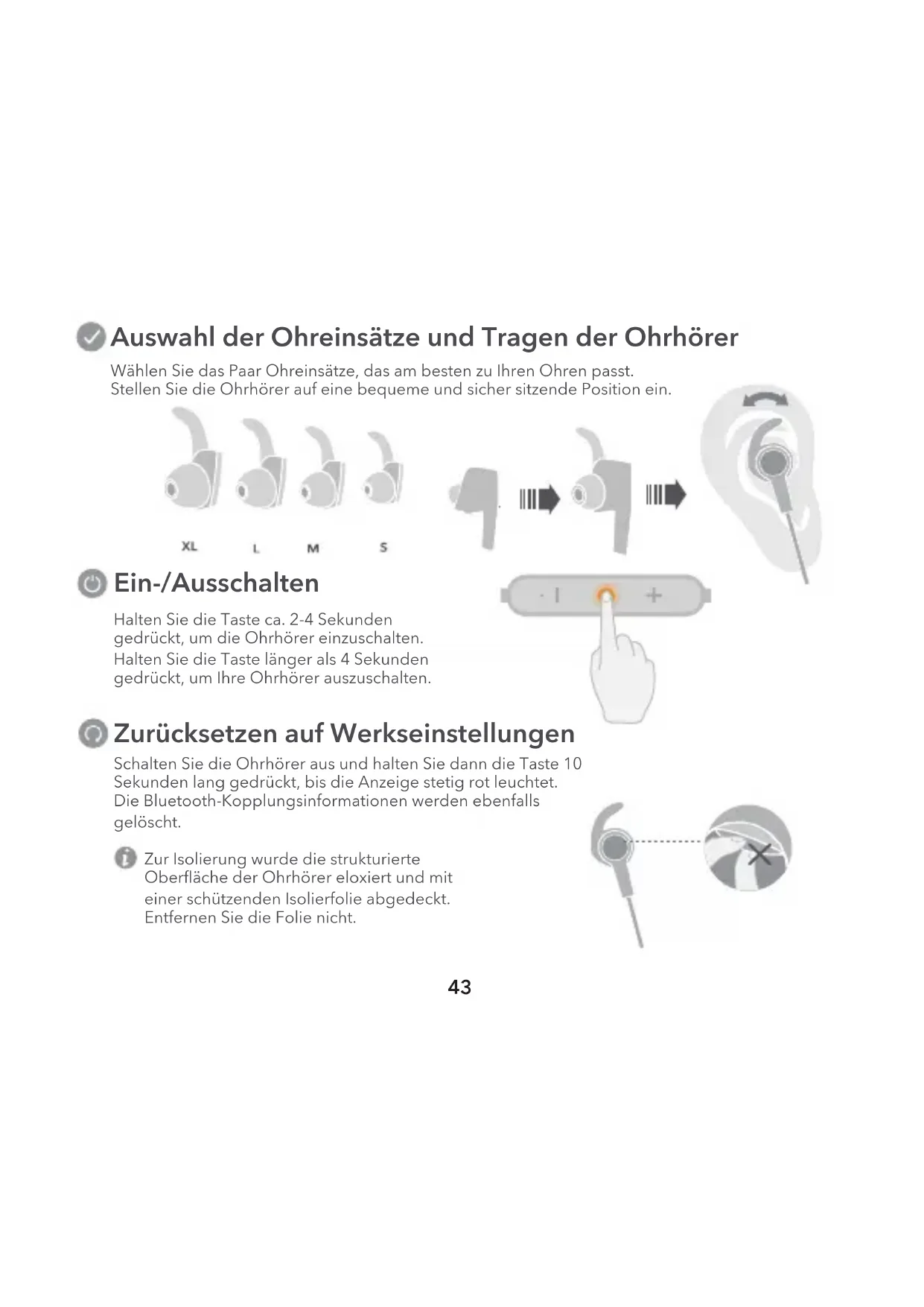 sous licence. Bluetooth: 2402 MHz - 2480 MHz: 5dBm.43 Auswahl der Ohreinsätze und Tragen der Ohrhörer Wählen Sie das Paar Ohreinsätze, das am besten zu Ihren Ohren passt. Stellen Sie die Ohrhörer auf eine bequeme und sicher sitzende Position ein. Ein-/Ausschalten Zurücksetzen auf Werkseinstellungen Halten Sie die Taste ca. 2-4 Sekunden gedrückt, um die Ohrhörer einzuschalten. Halten Sie die Taste länger als 4 Sekunden gedrückt, um Ihre Ohrhörer auszuschalten. Schalten Sie die Ohrhörer aus und halten Sie dann die Taste 10 Sekunden lang gedrückt, bis die Anzeige stetig rot leuchtet. Die Bluetooth-Kopplungsinformationen werden ebenfalls gelöscht. Zur Isolierung wurde die strukturierte Oberfläche der Ohrhörer eloxiert und mit einer schützenden Isolierfolie abgedeckt. Entfernen Sie die Folie nicht.44 Kopplung Beim ersten Einschalten wechseln die Ohrhörer automatisch in den Kopplungsmodus. Nach dem Aktivieren des Kopplungsmodus schalten sich die Ohrhörer wieder automatisch aus, wenn innerhalb von 3 Minuten keine Verbindung hergestellt wurde. Erneutes Verbinden beim Einschalten Wenn Sie die Ohrhörer einschalten, werden sie automatisch wieder mit dem Smartphone verbunden, mit dem sie zuletzt verbunden waren. Neuer Verbindungsaufbau nach Trennung aufgrund zu großem Abstands Nachdem die Ohrhörer von Ihrem Smartphone getrennt wurden: Wenn Sie in weniger als 10 Minuten in die Bluetooth-Reichweite zurückkehren, wird die Verbindung automatisch wieder aufgenommen. Wenn Sie innerhalb von 10-30 Minuten zurückkehren, kann die Verbindung manuell wieder hergestellt werden. Wenn Sie nicht binnen 30 Minuten zurückkehren, werden die Ohrhörer automatisch ausgeschaltet. Aufgrund von Unterschieden in der Bluetooth-Technologie unterstützen einige Smartphone-Modelle kein automatisches Wiederherstellen der Verbindung. Dies weist nicht auf ein Problem mit Ihren Ohrhörern hin. Verbindung mit zwei Smartphones