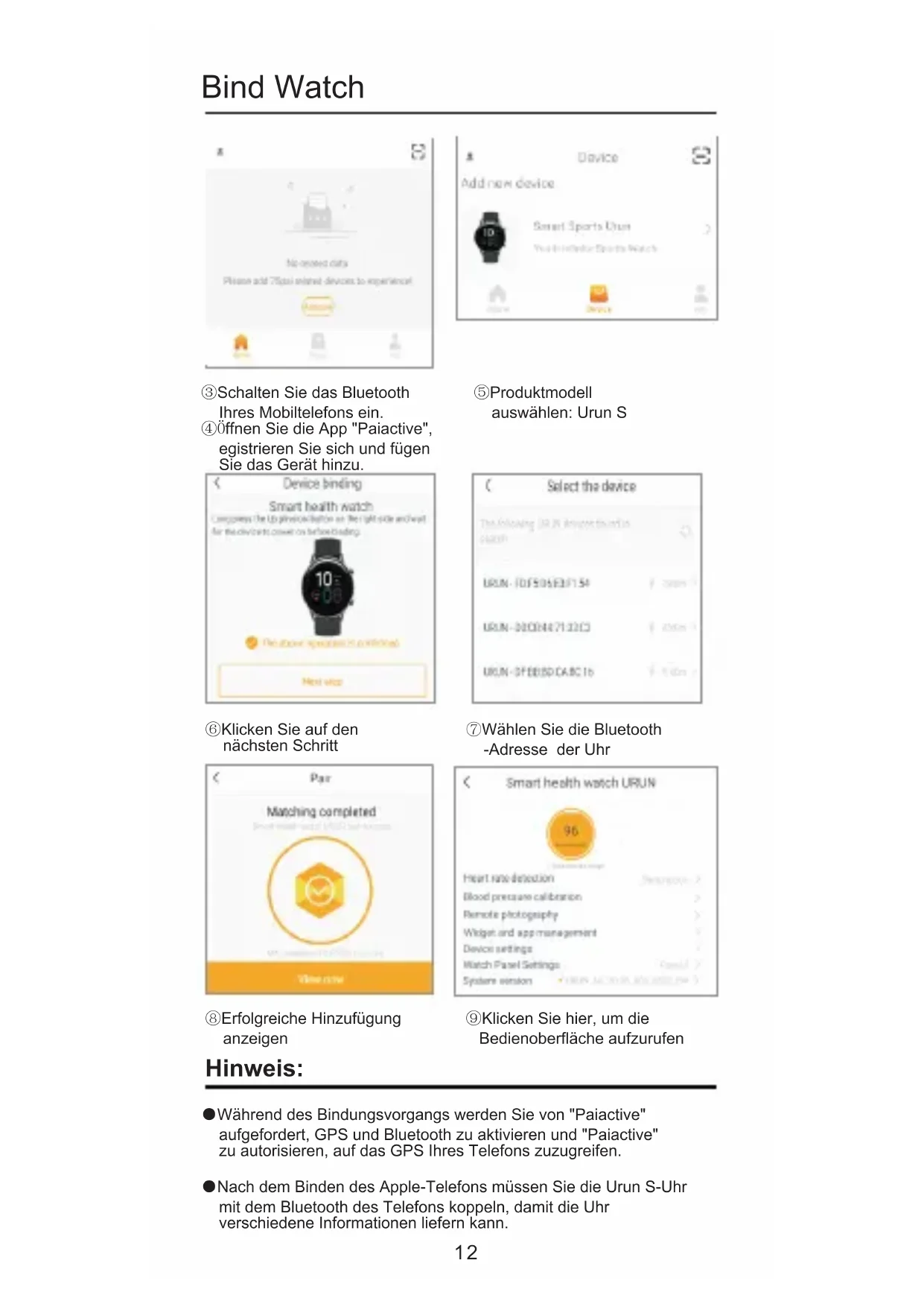 Definition der Aufwärtsschaltfläche: Drücken Sie lange die Aufwärts- Taste, um das Telefon einzuschalten. Drücken Sie in der Standby-Modus- Taste die Taste nach oben Drücken Sie die Taste, um die Hauptmenüo- berfläche aufzurufen Halten Sie die Aufwärts-Taste gedrückt, um zurückzukehren. Halten Sie sie 5 Sekunden lang gedrückt.Öffnen Sie die Option "Neustart" und "Herunter- fahren". Definition der Abwärtstaste: kurz drücken, eingeben Standardmäßig die Übung und dann die Übungso- berfläche. Drücken Sie kurz die Taste, um die Übung zu starten. Drücken Sie kurz die Taste in de Übungsoberfläche, führen Sie die Übungsdetails aus und ändern Sie die Definition der Abwärts- schaltfläche in den Einstellungen. Drücken Sie lange auf Taste zum Anzeigen der Version und der Bluetooth-Informationen. Tragen Sie das Gerät einen Fingera- bstand vom Handgelen kknochen und stellen Sie die Enge des Armbandes in eine bequeme Position. Schalten Sie den Schalter um und nehmen Sie das Armband heraus Tipp: Wenn Sie zu locker tragen, kann dies die Genau- igkeit Ihrer Herzfrequenzdaten beeinträchtigen. 10Bind Watch ③Schalten Sie das Bluetooth Ihres Mobiltelefons ein. ④Öffnen Sie die App "Paiactive", egistrieren Sie sich und fügen Sie das Gerät hinzu. ⑤Produktmodell auswählen: Urun S ⑥Klicken Sie auf den nächsten Schritt ⑦Wählen Sie die Bluetooth -Adresse der Uhr ⑧Erfolgreiche Hinzufügung anzeigen ⑨Klicken Sie hier, um die Bedienoberfläche aufzurufen ●Während des Bindungsvorgangs werden Sie von "Paiactive" aufgefordert, GPS und Bluetooth zu aktivieren und "Paiactive" zu autorisieren, auf das GPS Ihres Telefons zuzugreifen. ●Nach dem Binden des Apple-Telefons müssen Sie die Urun S-Uhr mit dem Bluetooth des Telefons koppeln, damit die Uhr verschiedene Informationen liefern kann. Hinweis: 12Die Daten werden in Echtzeit synchronisiert. Im Sportmodus können folgende Sportinformationen gespeichert werden: Synchrone Daten Sbewegen Sie den Bildschirm mit den Fingern in verschiedene Schnittstellen Wischen Sie nach unten: Shortcut-Oberfläche Wischen Sie nach oben: Informationen Wische nach rechts: Aktueller Status Nach links wischen: Pulsschlag Operation der Hauptschnittstellen 13Funktionseinführung Rufen Sie das Sportmenü auf, Sie können verschiedene Sportmodi auswählen Notieren Sie die neuesten Übungsdaten Aktueller Status; Anzahl der Schritte, Entfernung, Eine einzelne Herzfreque- nzmessung, die Ihre Herzf- requenzdaten überwacht. Die APP verfügt über einen kontinuierlichen Herzfrequenzmessschalter