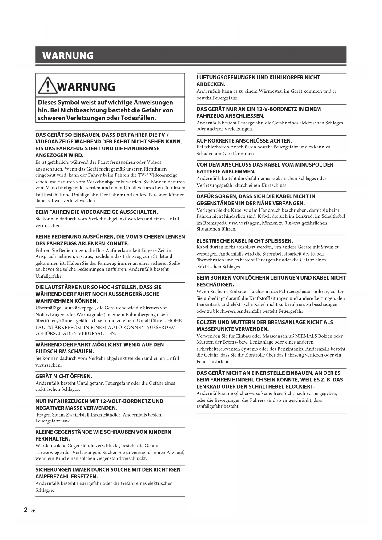 - Technische Daten ALPINE iLX-F905D 68-41657Z79-B_QRG (DE) ALPINE iLX-F905D 68-41657Z79-B_QRG (DE) 2-DE WARNUNG WARNUNG Dieses Symbol weist auf wichtige Anweisungen hin. Bei Nichtbeachtung besteht die Gefahr von schweren Verletzungen oder Todesfällen. DAS GERÄT SO EINBAUEN, DASS DER FAHRER DIE TV-/VIDEOANZEIGE WÄHREND DER FAHRT NICHT SEHEN KANN, BIS DAS FAHRZEUG STEHT UND DIE HANDBREMSE ANGEZOGEN WIRD.Es ist gefährlich, während der Fahrt fernzusehen oder Videos anzuschauen. Wenn das Gerät nicht gemäß unseren Richtlinien eingebaut wird, kann der Fahrer beim Fahren die TV-/ Videoanzeige sehen und dadurch vom Verkehr abgelenkt werden. Sie können dadurch vom Verkehr abgelenkt werden und einen Unfall verursachen. In diesem Fall besteht hohe Unfallgefahr. Der Fahrer und andere Personen können dabei schwer verletzt werden.BEIM FAHREN DIE VIDEOANZEIGE AUSSCHALTEN.Sie können dadurch vom Verkehr abgelenkt werden und einen Unfall verursachen.KEINE BEDIENUNG AUSFÜHREN, DIE VOM SICHEREN LENKEN DES FAHRZEUGS ABLENKEN KÖNNTE.Führen Sie Bedienungen, die Ihre Aufmerksamkeit längere Zeit in Anspruch nehmen, erst aus, nachdem das Fahrzeug zum Stillstand gekommen ist. Halten Sie das Fahrzeug immer an einer sicheren Stelle an, bevor Sie solche Bedienungen ausführen. Andernfalls besteht Unfallgefahr.DIE LAUTSTÄRKE NUR SO HOCH STELLEN, DASS SIE WÄHREND DER FAHRT NOCH AUSSENGERÄUSCHE WAHRNEHMEN KÖNNEN.Übermäßige Lautstärkepegel, die Geräusche wie die Sirenen von Notarztwagen oder Warnsignale (an einem Bahnübergang usw.) übertönen, können gefährlich sein und zu einem Unfall führen. HOHE LAUTSTÄRKEPEGEL IN EINEM AUTO KÖNNEN AUSSERDEM GEHÖRSCHÄDEN VERURSACHEN.WÄHREND DER FAHRT MÖGLICHST WENIG AUF DEN BILDSCHIRM SCHAUEN.Sie können dadurch vom Verkehr abgelenkt werden und einen Unfall verursachen.GERÄT NICHT ÖFFNEN.Andernfalls besteht Unfallgefahr, Feuergefahr oder die Gefahr eines elektrischen Schlages.NUR IN FAHRZEUGEN MIT 12-VOLT-BORDNETZ UND NEGATIVER MASSE VERWENDEN. Fragen Sie im Zweifelsfall Ihren Händler. Andernfalls besteht Feuergefahr usw.KLEINE GEGENSTÄNDE WIE SCHRAUBEN VON KINDERN FERNHALTEN.Werden solche Gegenstände verschluckt, besteht die Gefahr schwerwiegender Verletzungen. Suchen Sie unverzüglich einen Arzt auf, wenn ein Kind einen solchen Gegenstand verschluckt.SICHERUNGEN IMMER DURCH SOLCHE MIT DER RICHTIGEN AMPEREZAHL ERSETZEN.Andernfalls besteht Feuergefahr oder die Gefahr eines elektrischen Schlages.LÜFTUNGSÖFFNUNGEN UND KÜHLKÖRPER NICHT ABDECKEN.Andernfalls kann es zu einem Wärmestau im Gerät kommen und es besteht Feuergefahr.DAS GERÄT NUR AN EIN 12-V-BORDNETZ IN EINEM FAHRZEUG ANSCHLIESSEN.Andernfalls besteht Feuergefahr, die Gefahr eines elektrischen Schlages oder anderer Verletzungen.AUF KORREKTE ANSCHLÜSSE ACHTEN.Bei fehlerhaften Anschlüssen besteht Feuergefahr und es kann zu Schäden am Gerät kommen.VOR DEM ANSCHLUSS DAS KABEL VOM MINUSPOL DER BATTERIE ABKLEMMEN.Andernfalls besteht die Gefahr eines elektrischen Schlages oder Verletzungsgefahr durch einen Kurzschluss.DAFÜR SORGEN, DASS SICH DIE KABEL NICHT IN GEGENSTÄNDEN IN DER NÄHE VERFANGEN.Verlegen Sie die Kabel wie im Handbuch beschrieben, damit sie beim Fahren nicht hinderlich sind. Kabel, die sich im Lenkrad, im Schalthebel, im Bremspedal usw. verfangen, können zu äußerst gefährlichen Situationen führen.ELEKTRISCHE KABEL NICHT SPLEISSEN.Kabel dürfen nicht abisoliert werden, um andere Geräte mit Strom zu versorgen. Andernfalls wird die Strombelastbarkeit des Kabels überschritten und es besteht Feuergefahr oder die Gefahr eines elektrischen Schlages.BEIM BOHREN VON LÖCHERN LEITUNGEN UND KABEL NICHT BESCHÄDIGEN.Wenn Sie beim Einbauen Löcher in das Fahrzeugchassis bohren, achten Sie unbedingt darauf, die Kraftstoffleitungen und andere Leitungen, den Benzintank und elektrische Kabel nicht zu berühren, zu beschädigen oder zu blockieren. Andernfalls besteht Feuergefahr.BOLZEN UND MUTTERN DER BREMSANLAGE NICHT ALS MASSEPUNKTE VERWENDEN.Verwenden Sie für Einbau oder Masseanschluß NIEMALS Bolzen oder Muttern der Brems- bzw. Lenkanlage oder eines anderen sicherheitsrelevanten Systems oder des Benzintanks. Andernfalls besteht die Gefahr, dass Sie die Kontrolle über das Fahrzeug verlieren oder ein Feuer ausbricht.DAS GERÄT NICHT AN EINER STELLE EINBAUEN, AN DER ES BEIM FAHREN HINDERLICH SEIN KÖNNTE, WEIL ES Z. B. DAS LENKRAD ODER DEN SCHALTHEBEL BLOCKIERT.Andernfalls ist möglicherweise keine freie Sicht nach vorne gegeben, oder die Bewegungen des Fahrers sind so eingeschränkt, dass Unfallgefahr besteht. VORSICHT Dieses Symbol weist auf wichtige Anweisungen hin. Bei Nichtbeachtung besteht die Gefahr von Verletzungen bzw. Sachschäden. DAS GERÄT NICHT WEITERBENUTZEN, WENN EIN PROBLEM AUFTRITT. Andernfalls kann es zu Verletzungen oder Schäden am Gerät kommen. Geben Sie das Gerät zu Reparaturzwecken an einen autorisierten Alpine- Händler oder den nächsten Alpine-Kundendienst. p. 21
