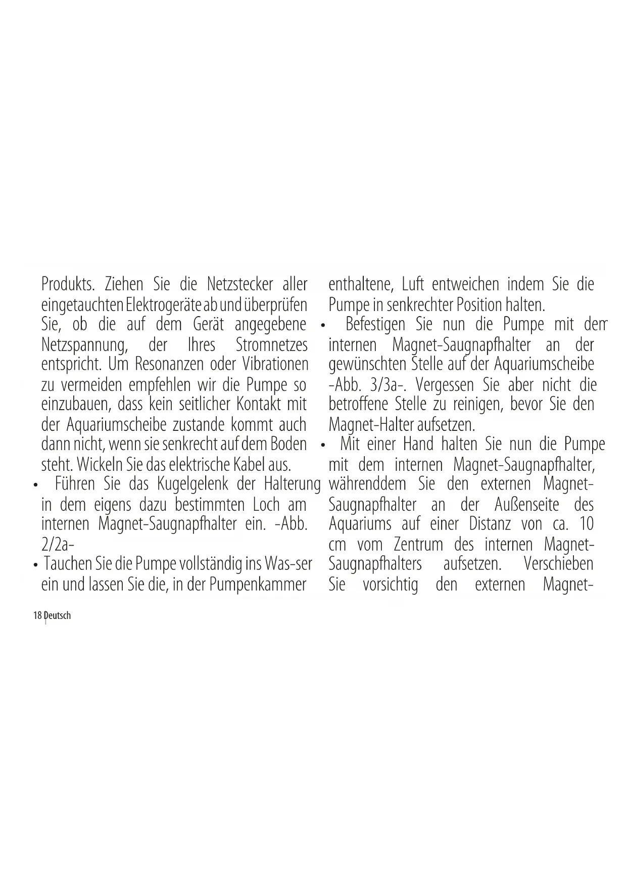 - Bevor Sie das Gerät in Betrieb nehmen, vergewissern Sie sich der Unversehrtheit des Deutsch 17Produkts. Ziehen Sie die Netzstecker aller eingetauchten Elektrogeräte ab und überprüfen Sie, ob die auf dem Gerät angegebene Netzspannung, der Ihres Stromnetzes entspricht. Um Resonanzen oder Vibrationen zu vermeiden empfehlen wir die Pumpe so einzubauen, dass kein seitlicher Kontakt mit der Aquariumscheibe zustande kommt auch dann nicht, wenn sie senkrecht auf dem Boden steht. Wickeln Sie das elektrische Kabel aus.