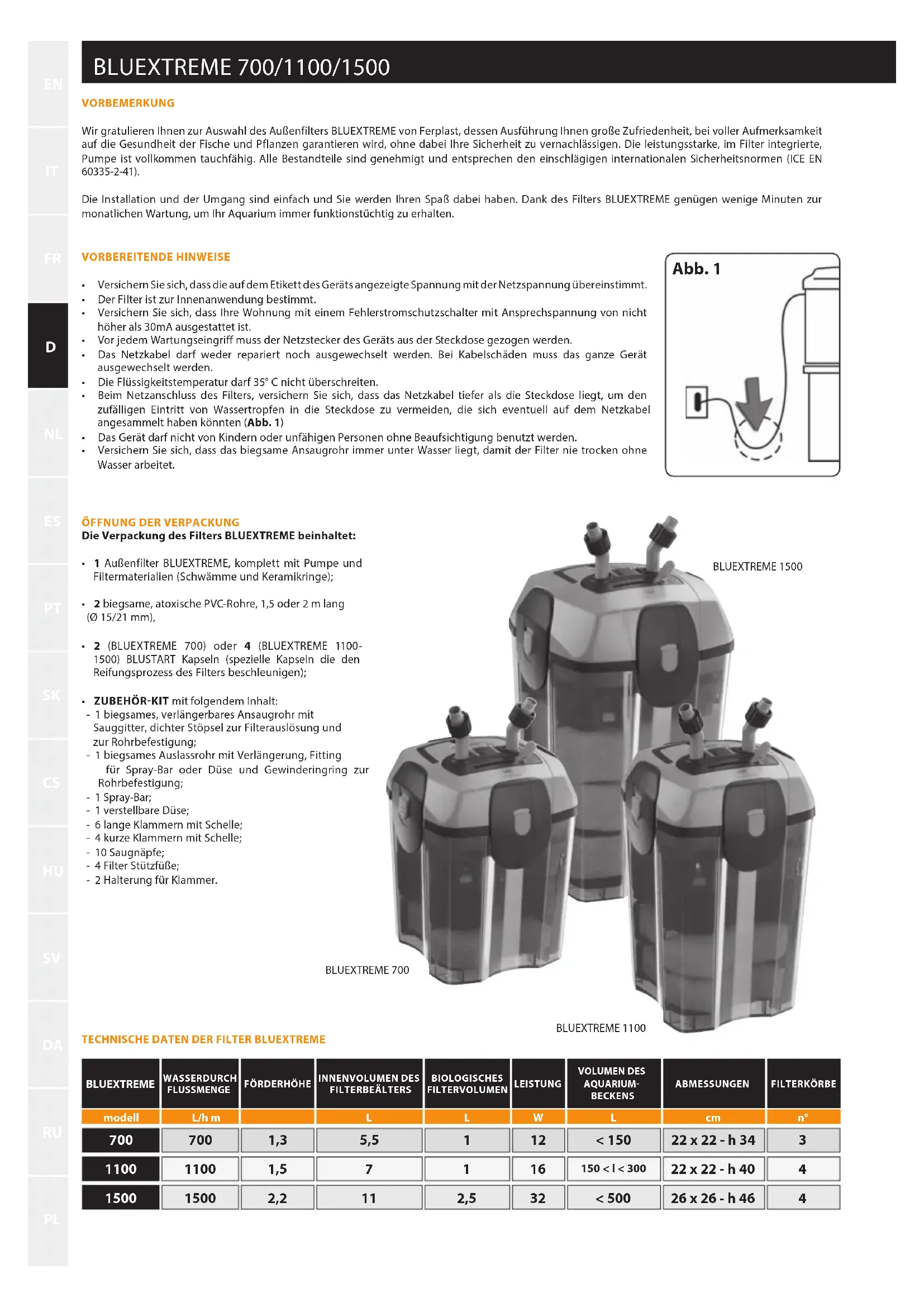 VORBEMERKUNG Wir gratulieren Ihnen zur Auswahl des Außenfilters BLUEXTREME von Ferplast, dessen Ausführung Ihnen große Zufriedenheit, bei voller Aufmerksamkeit auf die Gesundheit der Fische und Pflanzen garantieren wird, ohne dabei Ihre Sicherheit zu vernachlässigen. Die leistungsstarke, im Filter integrierte, Pumpe ist vollkommen tauchfähig. Alle Bestandteile sind genehmigt und entsprechen den einschlägigen internationalen Sicherheitsnormen (ICE EN 60335-2-41). Die Installation und der Umgang sind einfach und Sie werden Ihren Spaß dabei haben. Dank des Filters BLUEXTREME genügen wenige Minuten zur monatlichen Wartung, um Ihr Aquarium immer funktionstüchtig zu erhalten. Abb. 1