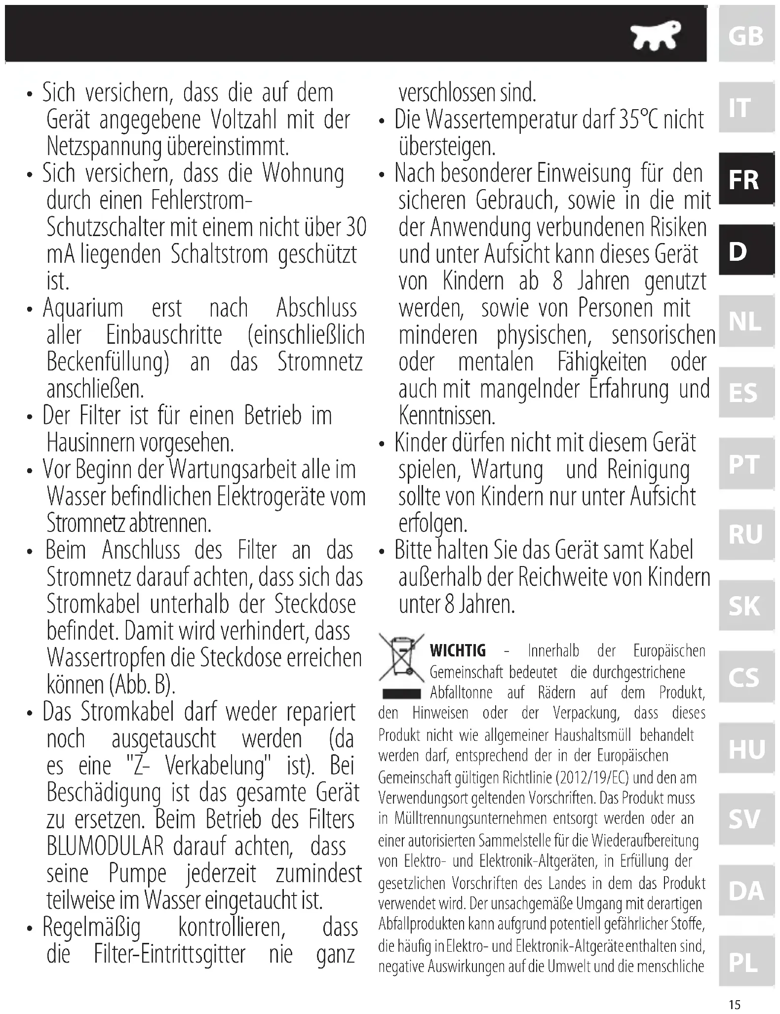 - Das Stromkabel darf weder repariert noch ausgetauscht werden (da es eine "Z- Verkabelung" ist). Bei Beschädigung ist das gesamte Gerät zu ersetzen. Beim Betrieb des Filters BLUMODULAR darauf achten, dass seine Pumpe jederzeit zumindest teilweise im Wasser eingetaucht ist.