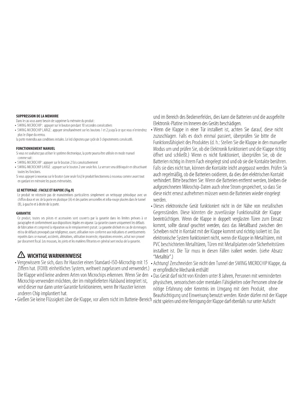 - SWING MICROCHIP LARGE – die Taste 1 einmalig Das elektronische System wird so ausgeschaltet. Durch erneutes Drücken der jeweligen Taste (nur einmal) wird das Produkt die elektronische Funktion reaktivieren. Die Erkennung des zuvor aufgezeichneten Mikrochips bleibt erhalten. REINIGUNG: SCHNELL UND EINFACH (Abb.9) Dieses Produkt erfordert keine besondere Wartung, nur die einfache Reinigung der Klappe (A) und der links und rechts im Tunnel platzierten Infrarot-Detektoren (B), mit einem weichen und trockenen Tuch. GARANTIE Auf das Produkt seine Komponenten und Zubehörteile sind die gesetzlichen Gewährleistungen anzuwenden. Die Garantie gilt ausschließlich für Fabrikationsfehler und umfasst die Reparatur oder die kostenlose Auswechselung. Die Garantie verfällt bei Schäden u/o Fehlern, verursacht durch Nachlässigkeit, Verschleiß, mit den Anzeigen und Hinweisen des Benutzerhandbuchs nicht übereinstimmende Verwendung, Unfällen, Beschädigungen, unzweckmäßigem Gebrauch, fehlerhaften Reparaturen, nicht nachweisbarer Kauf durch fehlenden Kassenbon. Ausgeschlossen aus der Garantie sind: die Schwämme, die Dichtungen und die allgemeinen Filtermaterialien.