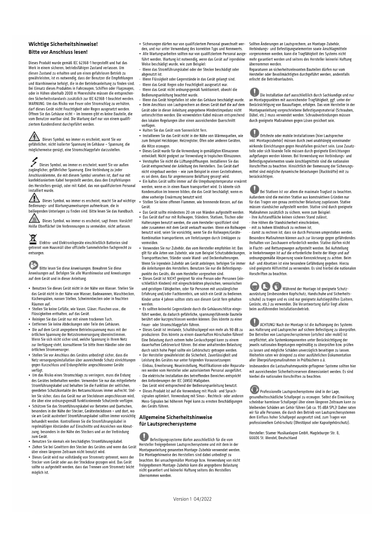 - Dieses Produkt ist auf die Verwendung mit Musik- und Sprach- signalen optimiert. Verwendung mit Sinus-, Rechteck- oder anderen Mess-Signalen bei höherem Pegel kann zu ernsten Beschädigungen des Geräts führen. Allgemeine Sicherheitshinweise für Lautsprechersysteme Befestigungssysteme dürfen ausschließlich für die vom Hersteller freigegebenen Lautsprechersysteme und mit dem in der Montageanleitung genannten Montage-Zubehör verwendet werden. Die Montagehinweise des Herstellers sind dabei unbedingt zu beachten. Bei unsachgemäßer Montage bzw. Verwendung von nicht freigegebenem Montage-Zubehör kann die angegebene Belastung nicht garantiert und keinerlei Haftung seitens des Herstellers übernommen werden. Sollten Änderungen an Lautsprechern, an Montage-Zubehör, Verbindungs- und Befestigungselementen sowie Anschlagmitteln vorgenommen werden, kann die Tragfähigkeit des Systems nicht mehr garantiert werden und seitens des Hersteller keinerlei Haftung übernommen werden. Reparaturen an sicherheitsrelevanten Bauteilen dürfen nur vom Hersteller oder Bevollmächtigten durchgeführt werden, andernfalls erlischt die Betriebserlaubnis. Die Installation darf ausschließlich durch Sachkundige und nur an Montagepunkten mit ausreichender Tragfähigkeit, ggf. unter der Berücksichtigung von Bauauflagen, erfolgen. Das vom Hersteller in der Montageanleitung vorgeschriebene Befestigungsmaterial (Schrauben, Dübel, etc.) muss verwendet werden. Schraubverbindungen müssen durch geeignete Maßnahmen gegen Lösen gesichert sein. Ortsfeste oder mobile Installationen (hier Lautsprecher inkl. Montagezubehör) müssen durch zwei unabhängig voneinander wirkende Einrichtungen gegen Herabfallen gesichert sein. Lose Zusatz- teile oder sich lösende Teile müssen durch geeignete Einrichtungen aufgefangen werden können. Bei Verwendung von Verbindungs- und Befestigungselementen sowie Anschlagmitteln sind die nationalen Vorschriften zu beachten. Hinsichtlich der Bemessung der Sicherungs- mittel sind mögliche dynamische Belastungen (Ruckkräfte) mit zu berücksichtigen. Bei Stativen ist vor allem die maximale Traglast zu beachten. Außerdem sind die meisten Stative aus konstruktiven Gründen nur für das Tragen von genau zentrischer Belastung zugelassen. Stative müssen standsicher aufgestellt werden. Stative sind durch geeignete Maßnahmen zusätzlich zu sichern, wenn zum Beispiel: - ihre Aufstandfläche keinen sicheren Stand zulässt, - ihre Höhen die Standsicherheit einschränken, - mit zu hohem Winddruck zu rechnen ist, - damit zu rechnen ist, dass sie durch Personen umgestoßen werden. Besondere Maßnahmen können auch zur Vorsorge gegen gefährdendes Verhalten von Zuschauern erforderlich werden. Stative dürfen nicht in Flucht- und Rettungswegen aufgestellt werden. Bei Aufstellung in Verkehrswegen ist auf die erforderliche Breite der Wege und auf ordnungsgemäße Absperrung sowie Kennzeichnung zu achten. Beim Auf- und Absetzen ist eine besondere Gefährdung gegeben. Hierzu sind geeignete Hilfsmittel zu verwenden. Es sind hierbei die nationalen Vorschriften zu beachten. Während der Montage ist geeignete Schutz- ausrüstung (insbesondere Kopfschutz, Handschuhe und Sicherheits- schuhe) zu tragen und es sind nur geeignete Aufstiegshilfen (Leitern, Gerüste, etc.) zu verwenden. Die Verantwortung dafür liegt alleine beim ausführenden Installationsbetrieb. ACHTUNG! Nach der Montage ist die Aufhängung des Systems aus Halterung und Lautsprecher auf sichere Befestigung zu überprüfen. Der Betreiber von Lautsprechersystemen (ortsfest oder mobil) ist verpflichtet, alle Systemkomponenten unter Berücksichtigung der jeweils nationalen Regelungen regelmäßig zu überprüfen bzw. prüfen zu lassen und mögliche Schäden unverzüglich beseitigen zu lassen. Weiterhin raten wir dringend zu einer ausführlichen Dokumentation aller Überprüfungsmaßnahmen in Prüfbüchern o.ä. Insbesondere die Lastaufnahmepunkte geflogener Systeme sollten hier mit ausreichenden Sicherheitsreserven dimensioniert werden. Es sind hierbei die nationalen Vorschriften zu beachten. Professionelle Lautsprechersysteme sind in der Lage, gesundheitsschädliche Schallpegel zu erzeugen. Selbst die Einwirkung scheinbar harmloser Schallpegel über einen längeren Zeitraum kann zu bleibenden Schäden am Gehör führen (ab ca. 95dBA SPL)! Daher raten wir für alle Personen, die durch den Betrieb von Lautsprechersystemen dem Einfluss hoher Schallpegel ausgesetzt sind, zum Tragen von professionellem Gehörschutz (Ohrstöpsel oder Kapselgehörschutz). Hersteller: Stamer Musikanlagen GmbH, Magdeburger Str. 8, 66606 St. Wendel, DeutschlandPOLAR 8 1.0