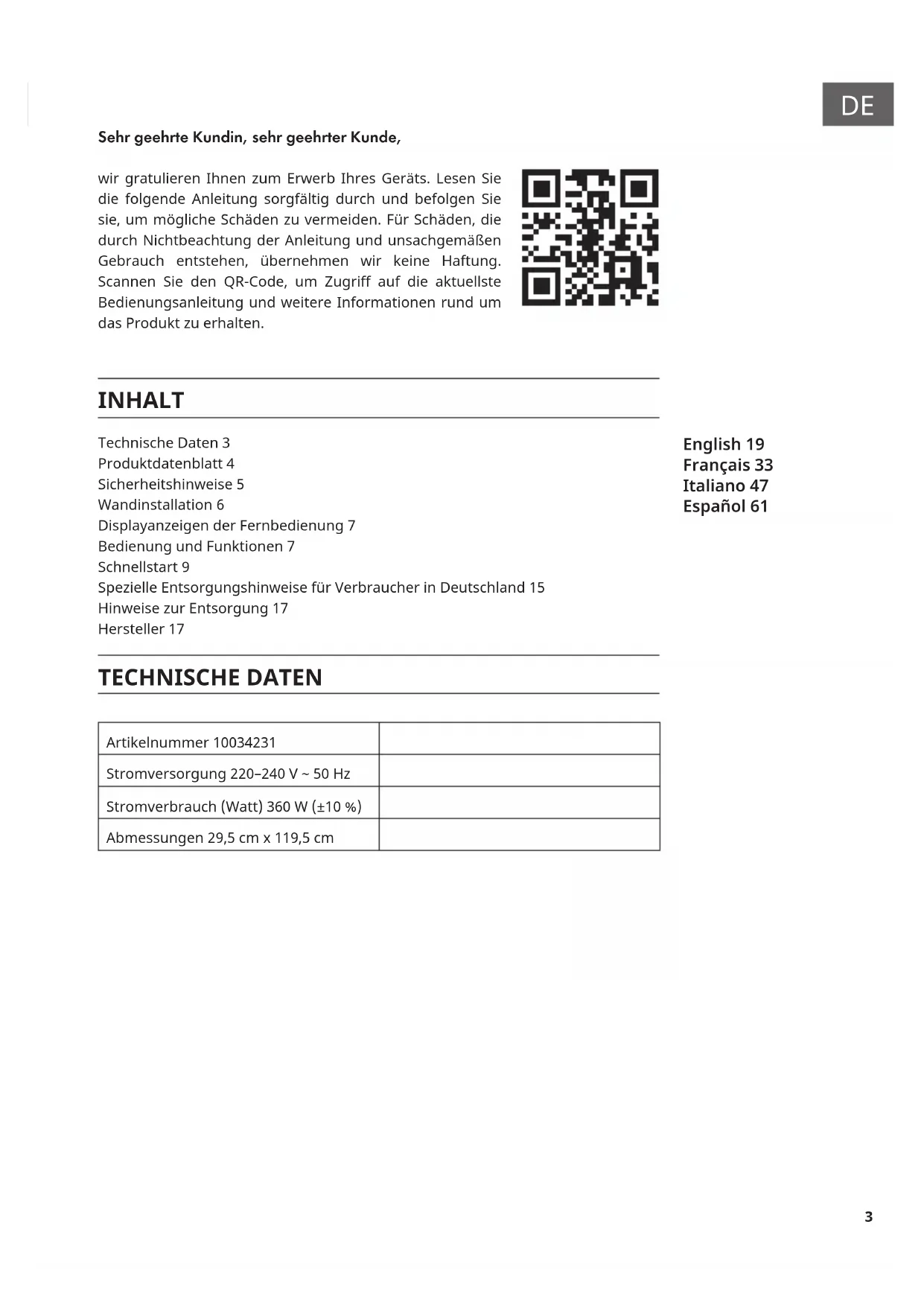 English 19 Français 33 Italiano 47 Español 61 Sehr geehrte Kundin, sehr geehrter Kunde, wir gratulieren Ihnen zum Erwerb Ihres Geräts. Lesen Sie die folgende Anleitung sorgfältig durch und befolgen Sie sie, um mögliche Schäden zu vermeiden. Für Schäden, die durch Nichtbeachtung der Anleitung und unsachgemäßen Gebrauch entstehen, übernehmen wir keine Haftung. Scannen Sie den QR-Code, um Zugriff auf die aktuellste Bedienungsanleitung und weitere Informationen rund um das Produkt zu erhalten. INHALT TECHNISCHE DATEN Artikelnummer 10034231 Stromversorgung 220–240 V ~ 50 Hz Stromverbrauch (Watt) 360 W (±10 %) Abmessungen 29,5 cm x 119,5 cm Technische Daten 3 Produktdatenblatt 4 Sicherheitshinweise 5 Wandinstallation 6 Displayanzeigen der Fernbedienung 7 Bedienung und Funktionen 7 Schnellstart 9 Spezielle Entsorgungshinweise für Verbraucher in Deutschland 15 Hinweise zur Entsorgung 17 Hersteller 174