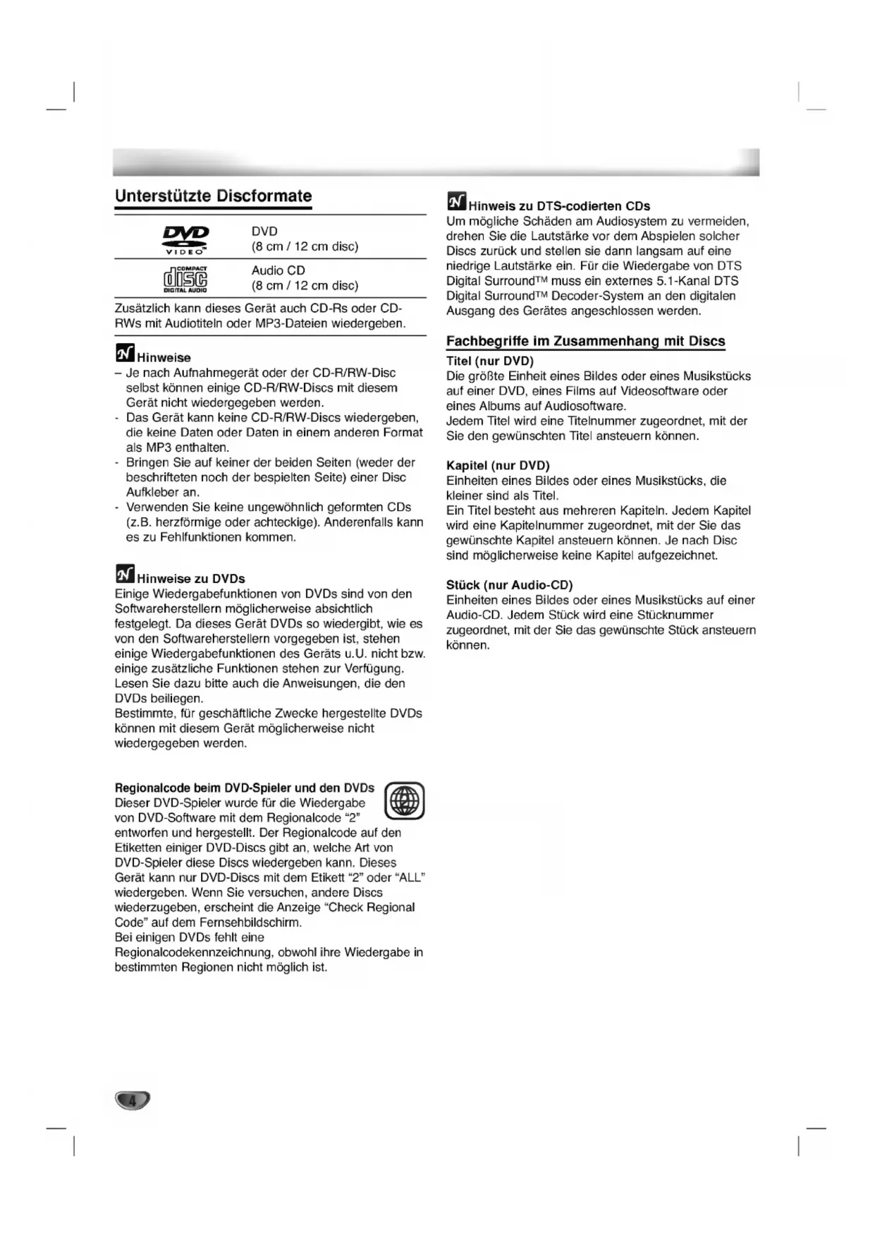 von denSoftwareherstellernvorgegeben ist, steheneinigeWiedergabefunktionendesGer tsu.U.nichtbzw.einigezus tzlicheFunktionenstehen zur Verf gung.LesenSiedazubitteauchdieAnweisungen,diedenDVDsbeiliegen. Bestimmte, f rgesch ftlicheZweckehergestellteDVDsk nnenmitdiesemGer tm glicherweisenichtwiedergegebenwerden.Regionalcodebeim DVD-Spieler unddenDVDsDieser DVD-Spieler wurdef rdieWiedergabe von DVD-SoftwaremitdemRegionalcode"2"entworfenundhergestellt.DerRegionalcodeaufdenEtiketteneinigerDVD-Discsgibt an, welcheArt von DVD-Spieler dieseDiscswiedergebenkann.DiesesGer tkann nur DVD-DiscsmitdemEtikett"2"oder"ALL"wiedergeben.WennSie versuchen, andereDiscswiederzugeben,erscheintdieAnzeige"CheckRegionalCode"aufdemFernsehbildschirm.BeieinigenDVDsfehlteineRegionalcodekennzeichnung,obwohlihreWiedergabeinbestimmtenRegionennichtm glichist.Hinweis DTS-codiertenCDsUmm glicheSch den Audiosystem